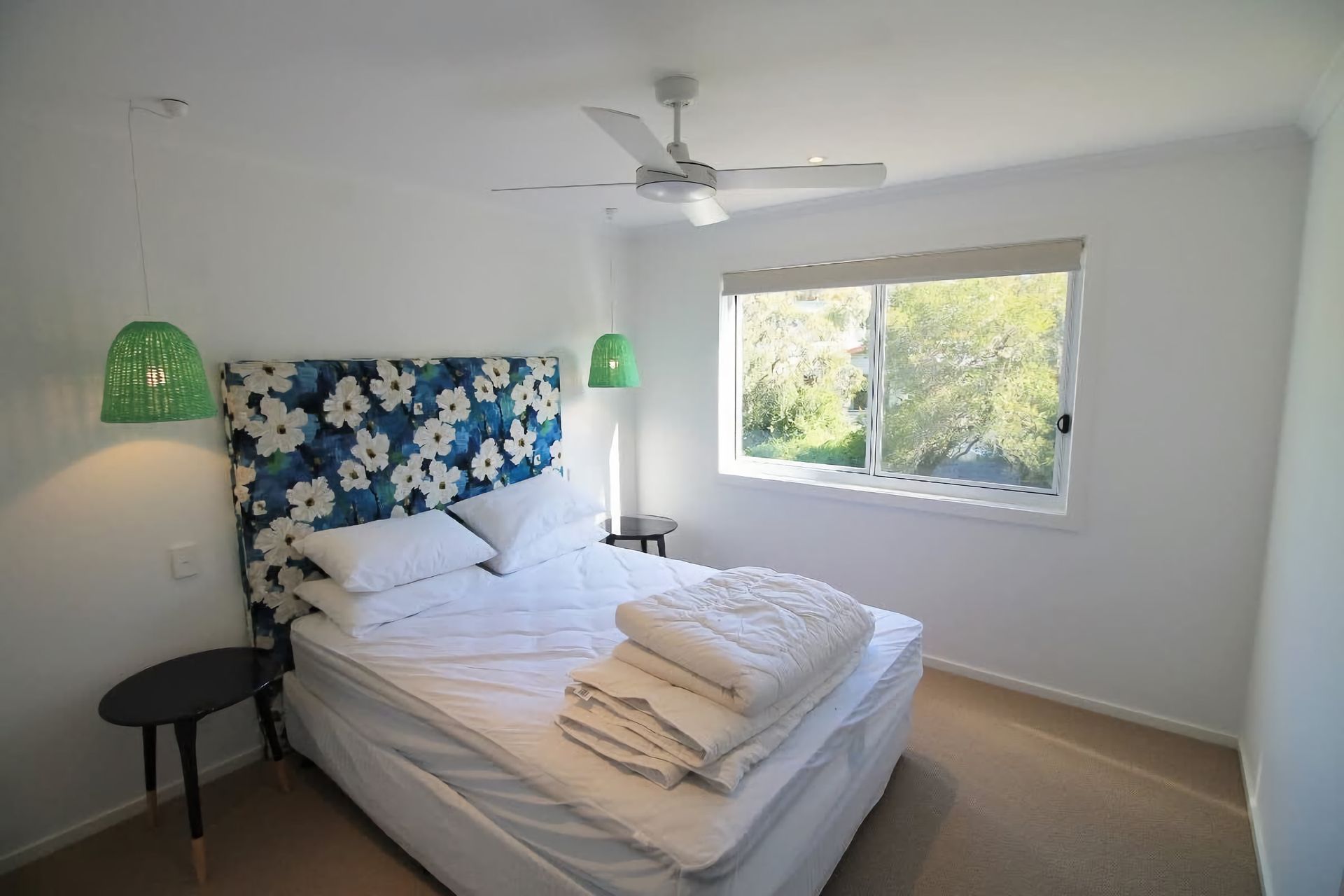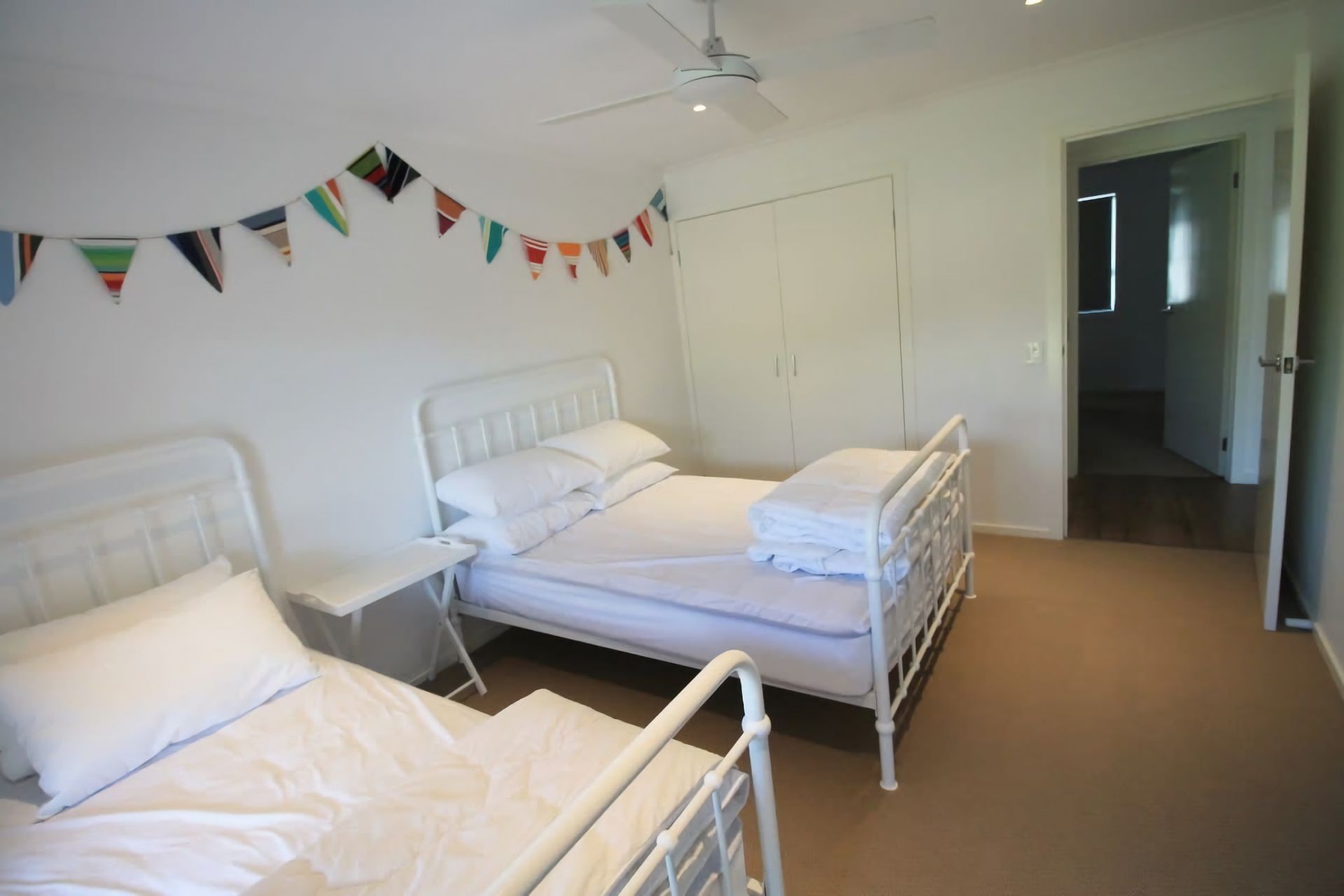 Downstairs is a large family room with a flat screen TV and Playstation games console. Two bedrooms are also downstairs, one with a double bed and a single bed and the other with a queen bed. Both rooms have lots of storage space with built in wardrobes. All three bedrooms have a ceiling fan. Bedding (doonas, blankets, pillows) for all beds is provided but guests will need to provide their own linen (sheets, covers) and towels.