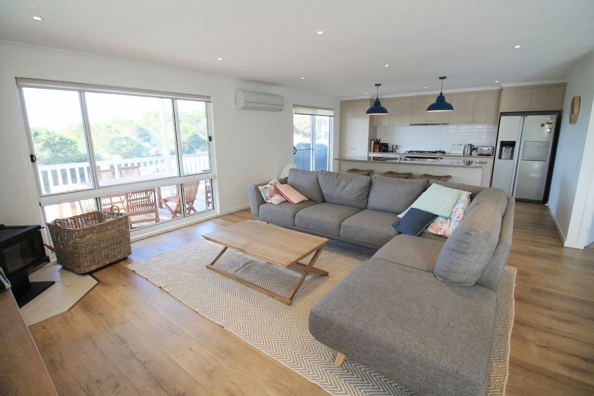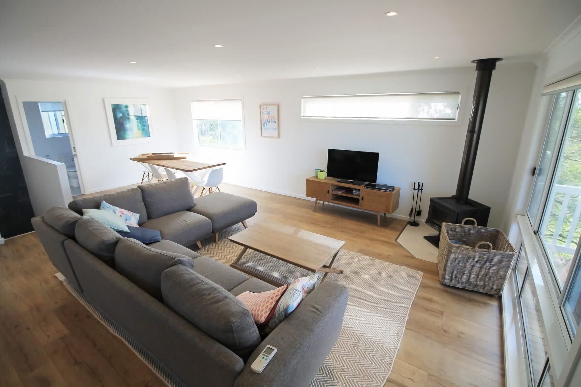 Upstairs, the spacious open plan living/dining/kitchen space makes the most of the stunning views. There is a flat screen TV, DVD player, RC/AC and a feature wood heater. The modern kitchen features a dishwasher and large fridge with ice dispenser. There is a coffee machine with milk frother - please bring Lavazza Modo Mio pods.There's dining space for 7 guests inside, with outdoor dining for 7 and a stainless steel BBQ on the large front deck as well.