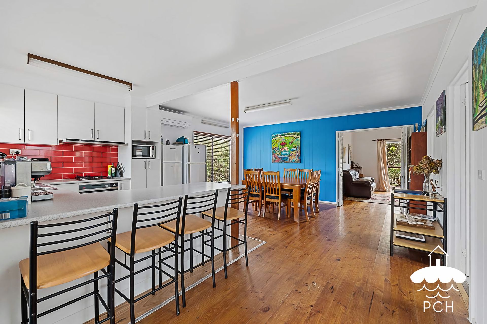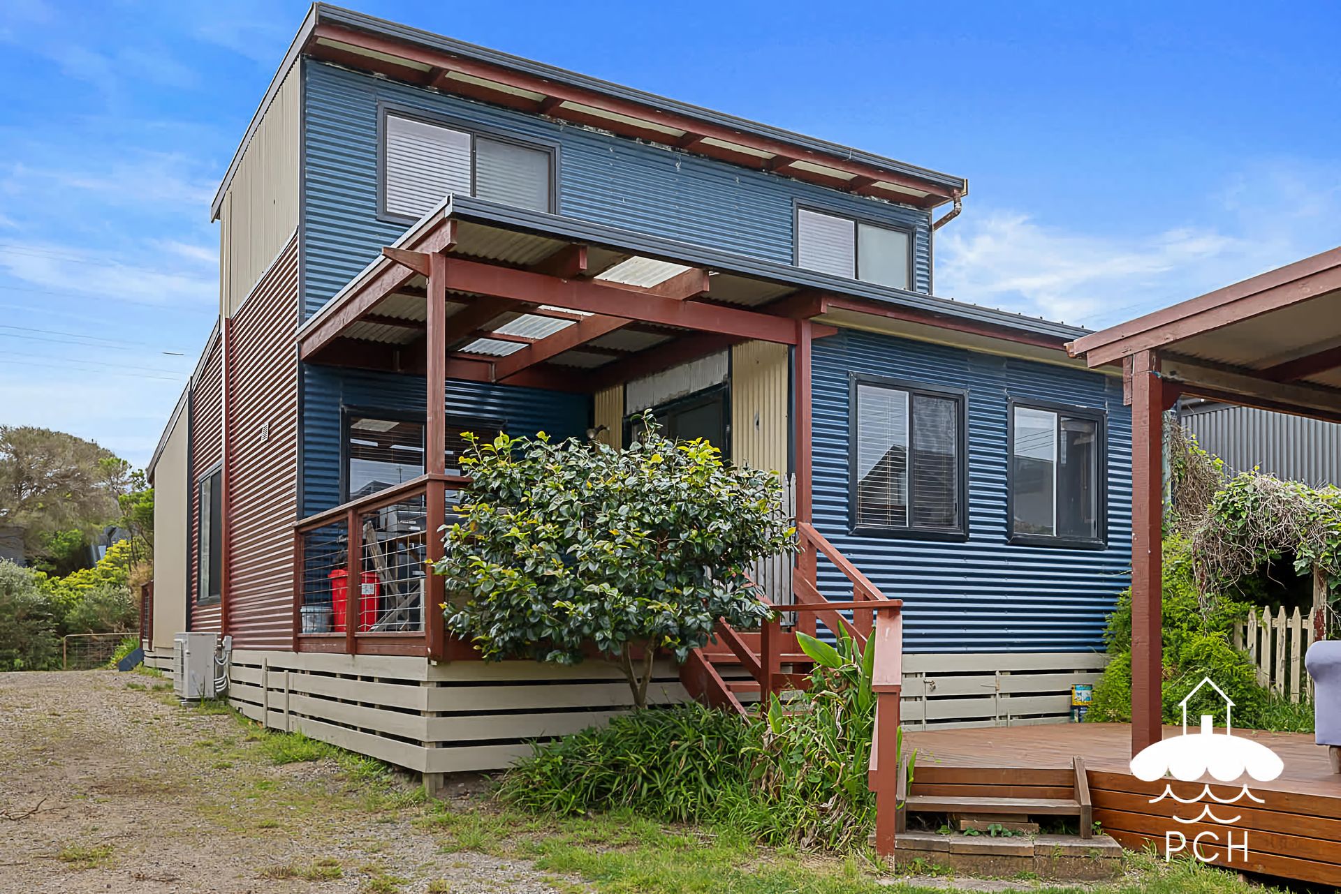 A great two storey family beach house that sleeps up to 11 people. It is an older style house with lots of light filled-spaces.