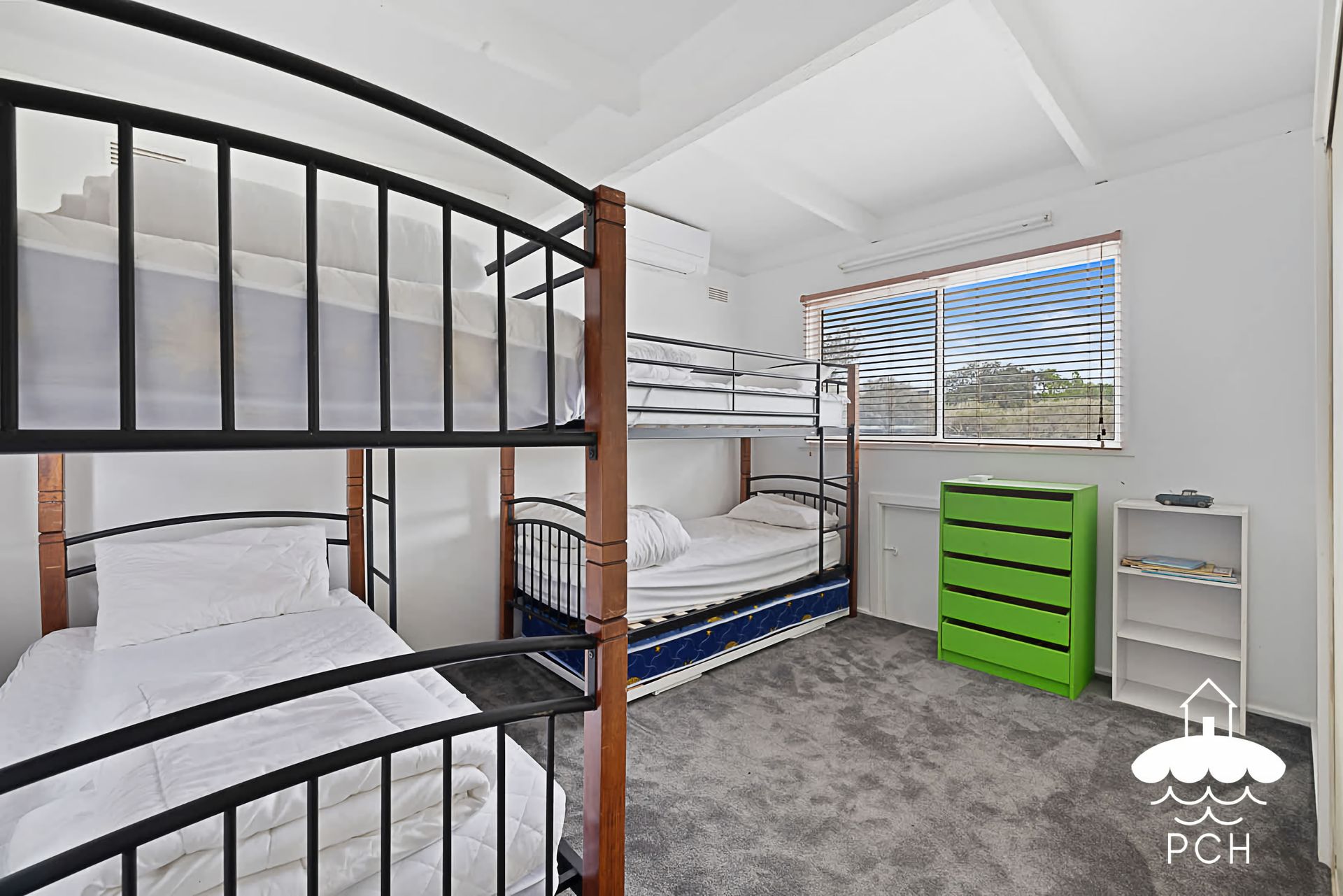 The master bedroom downstairs has a queen size bed, with two bedrooms upstairs - one with 2 sets of single bunk beds and the second with a single over double bunk. All bedrooms have built in robes.