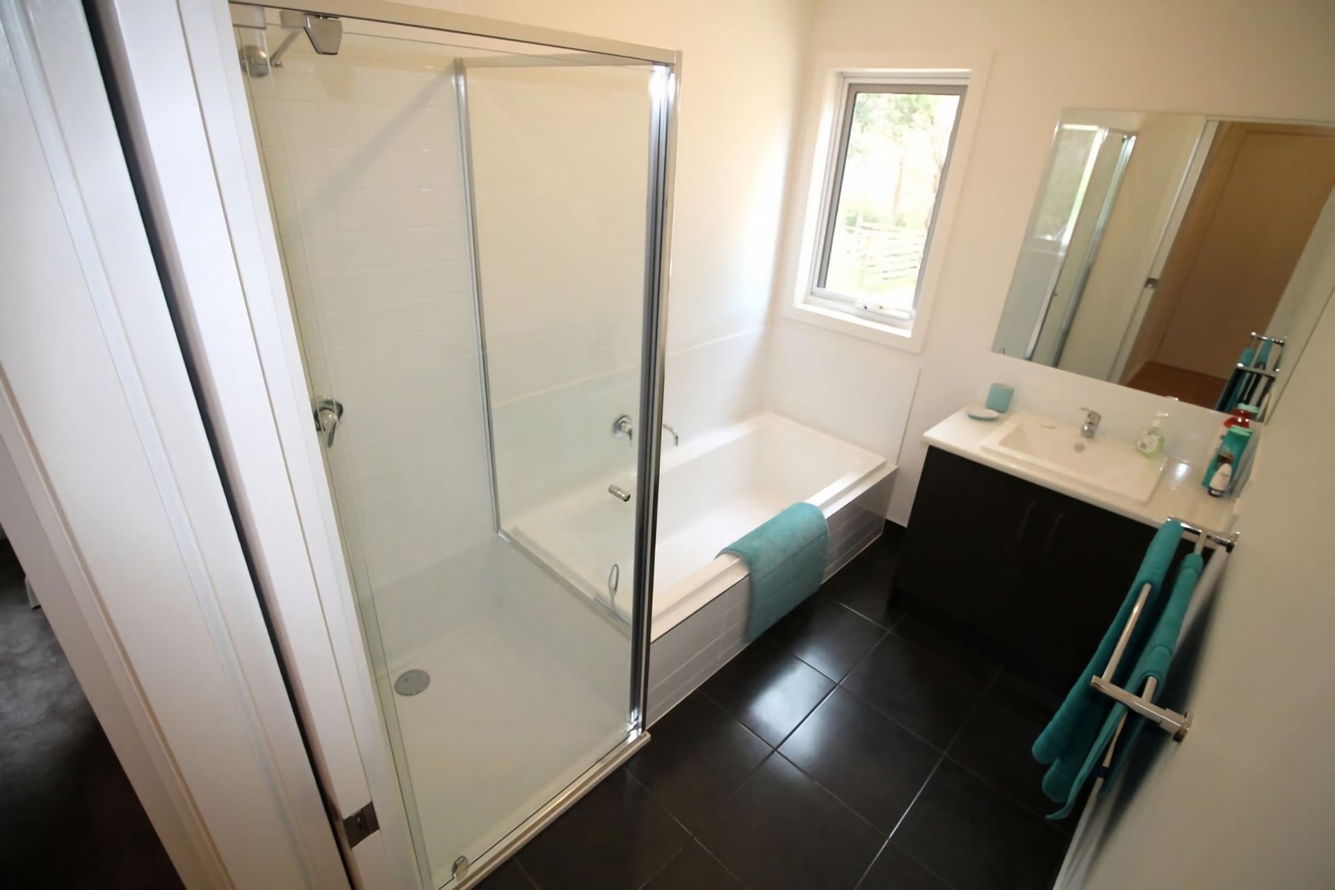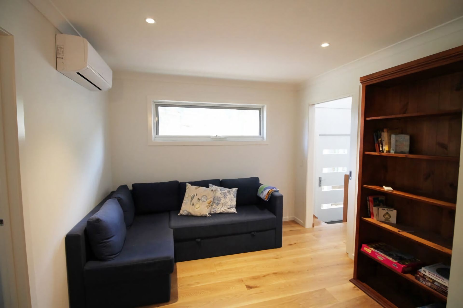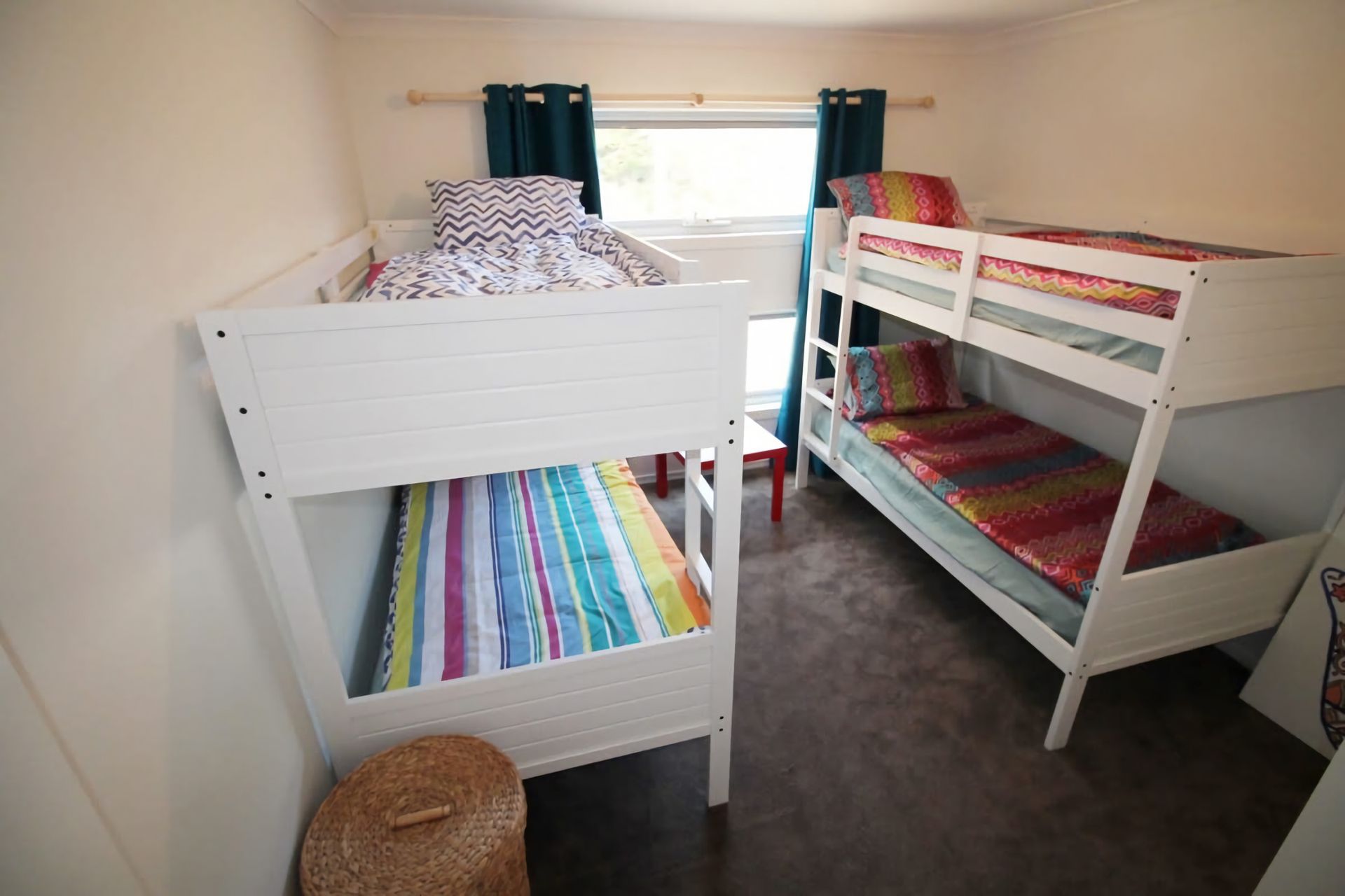 Downstairs are two bedrooms, one with a queen bed and generous built in robe and the second with two sets of bunk beds. The family bathroom nearby has a full size bathtub in addition to the shower, plus a separate toilet. There is also a sitting area downstairs with a TV and DVD player, books and comfy couch. This area is perfect to keep the kids entertained, or the couch may be converted into a double bed for extras to sleep on (no doona or pillows provided for this, you will need to bring your own). We will approve up to 10 guests.There is a RC/AC unit in the sitting area downstairs.