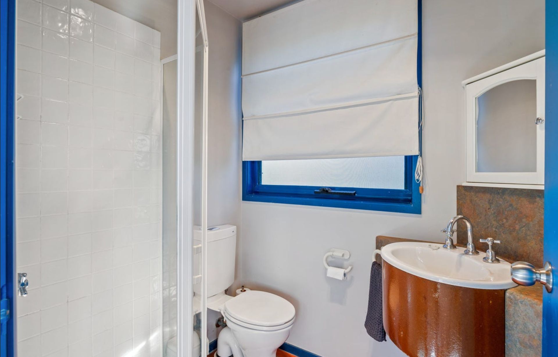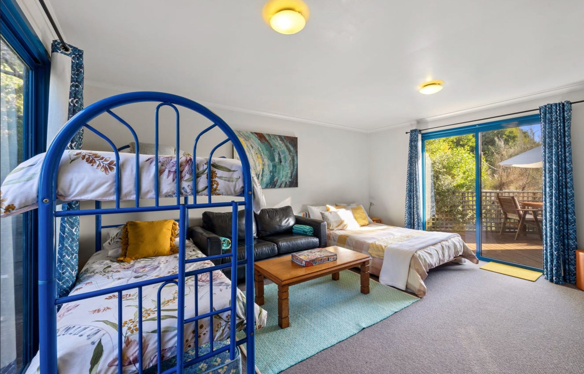Down the hallway, you’ll find the main bathroom, a separate toilet, and two inviting bedrooms that open onto a shared deck. The first bedroom has a cosy queen bed, while the second offers both a queen bed and a set of bunks — great for families or groups of friends.