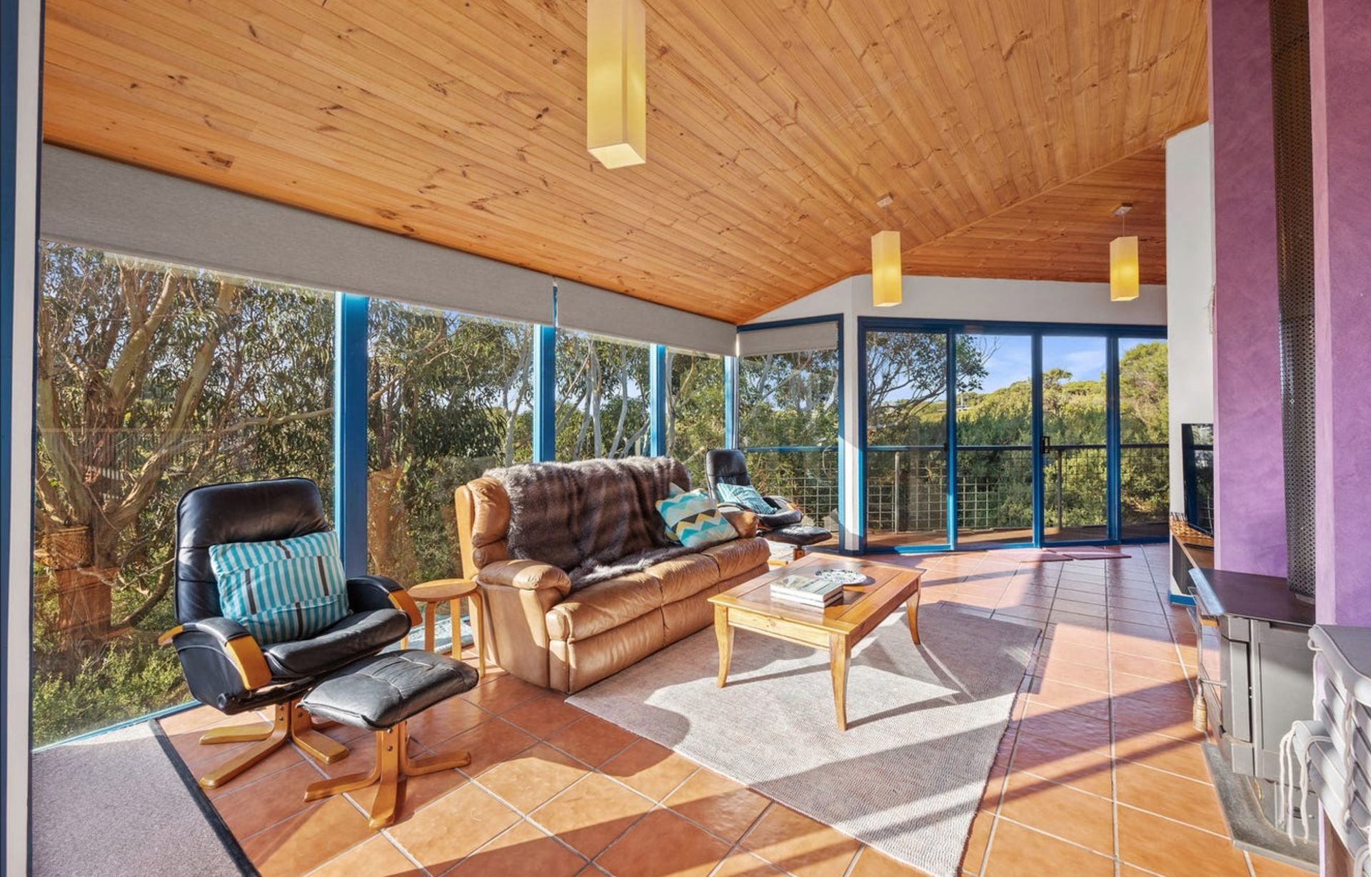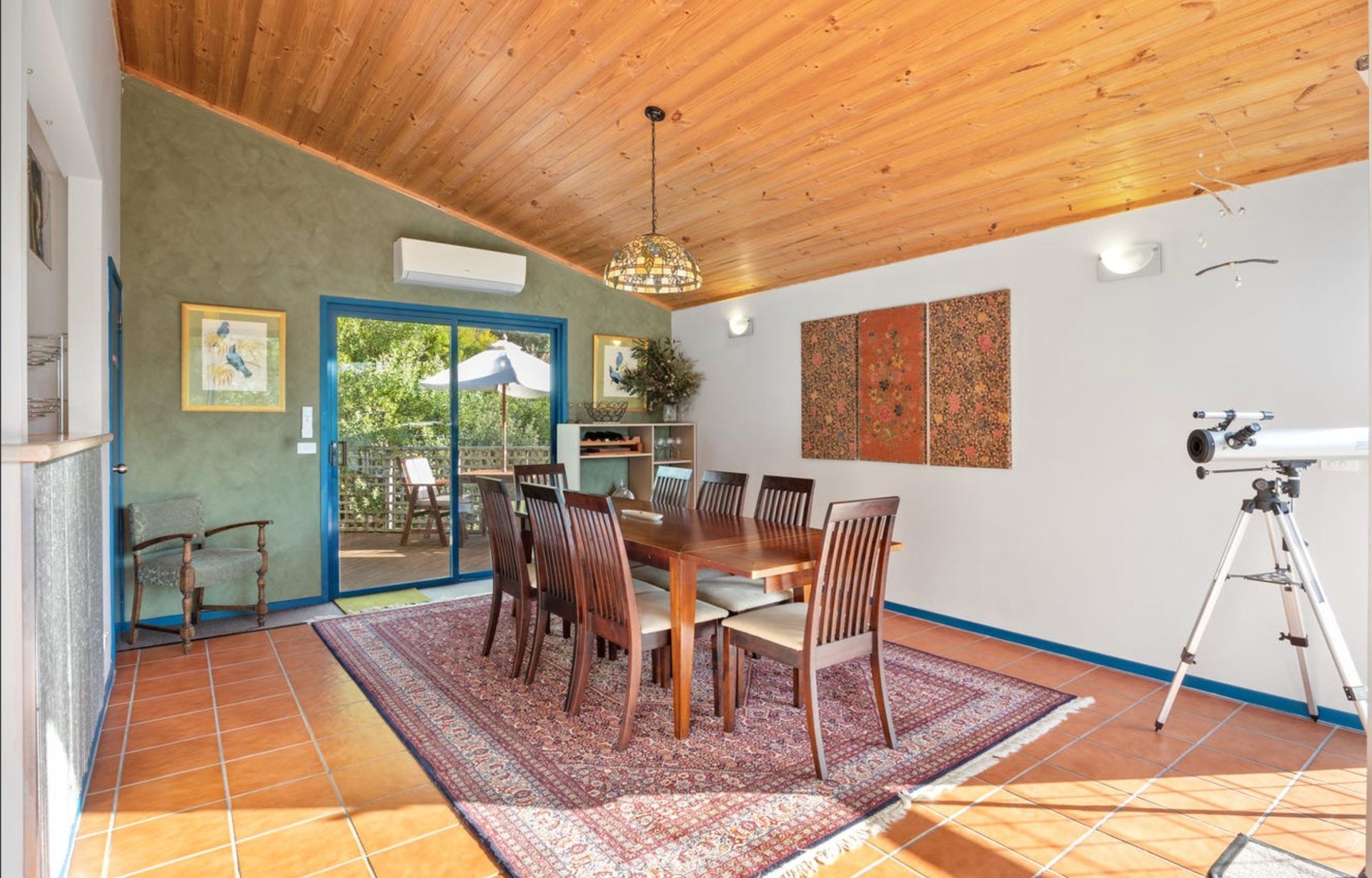 In the living room, sink into the comfy seating by the crackling wood fire (firewood supplied) — the ultimate spot to unwind on cool winter nights. When summer rolls around, the reverse-cycle air conditioner in the dining area keeps the whole space cool and comfortable.
