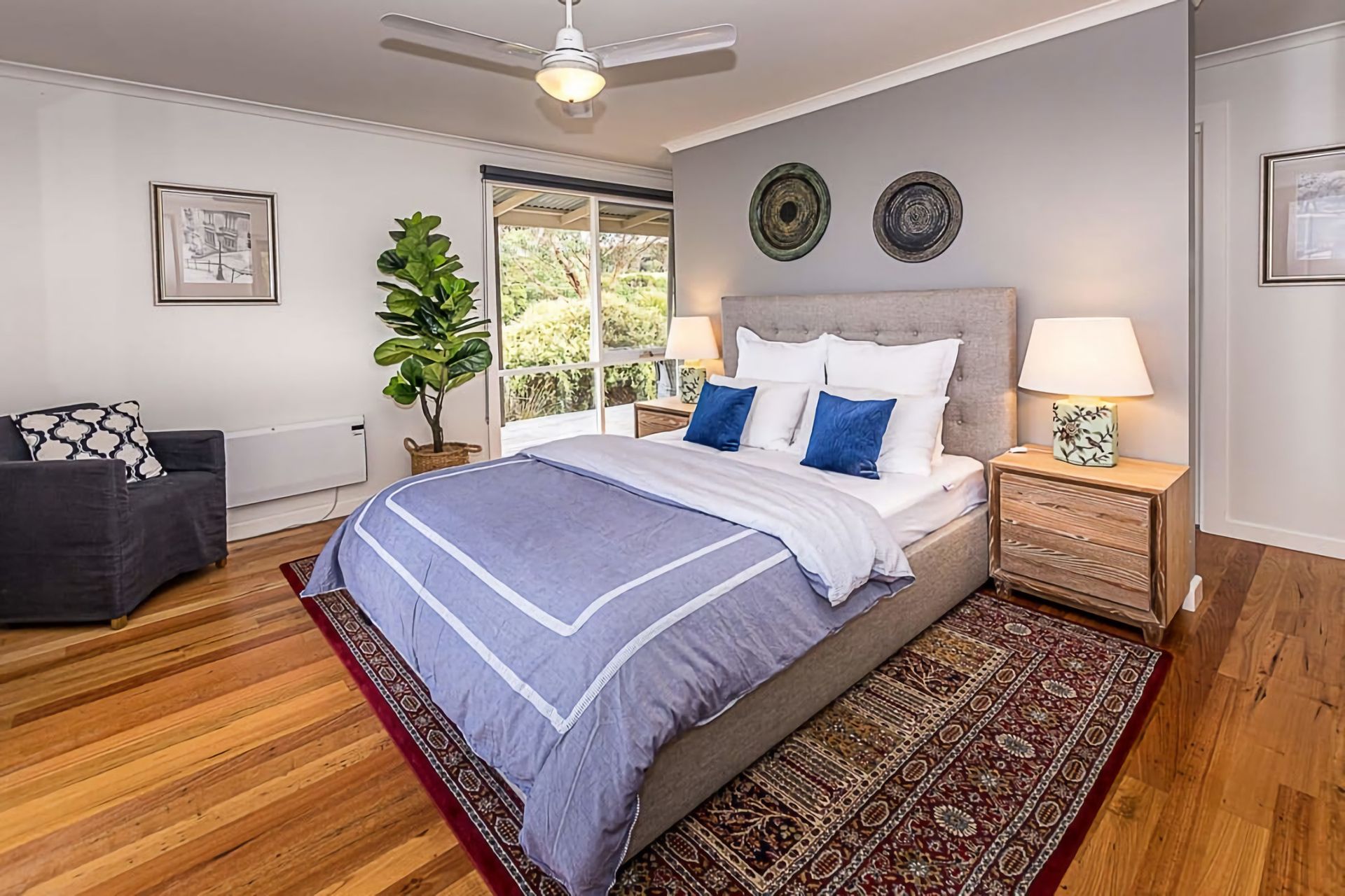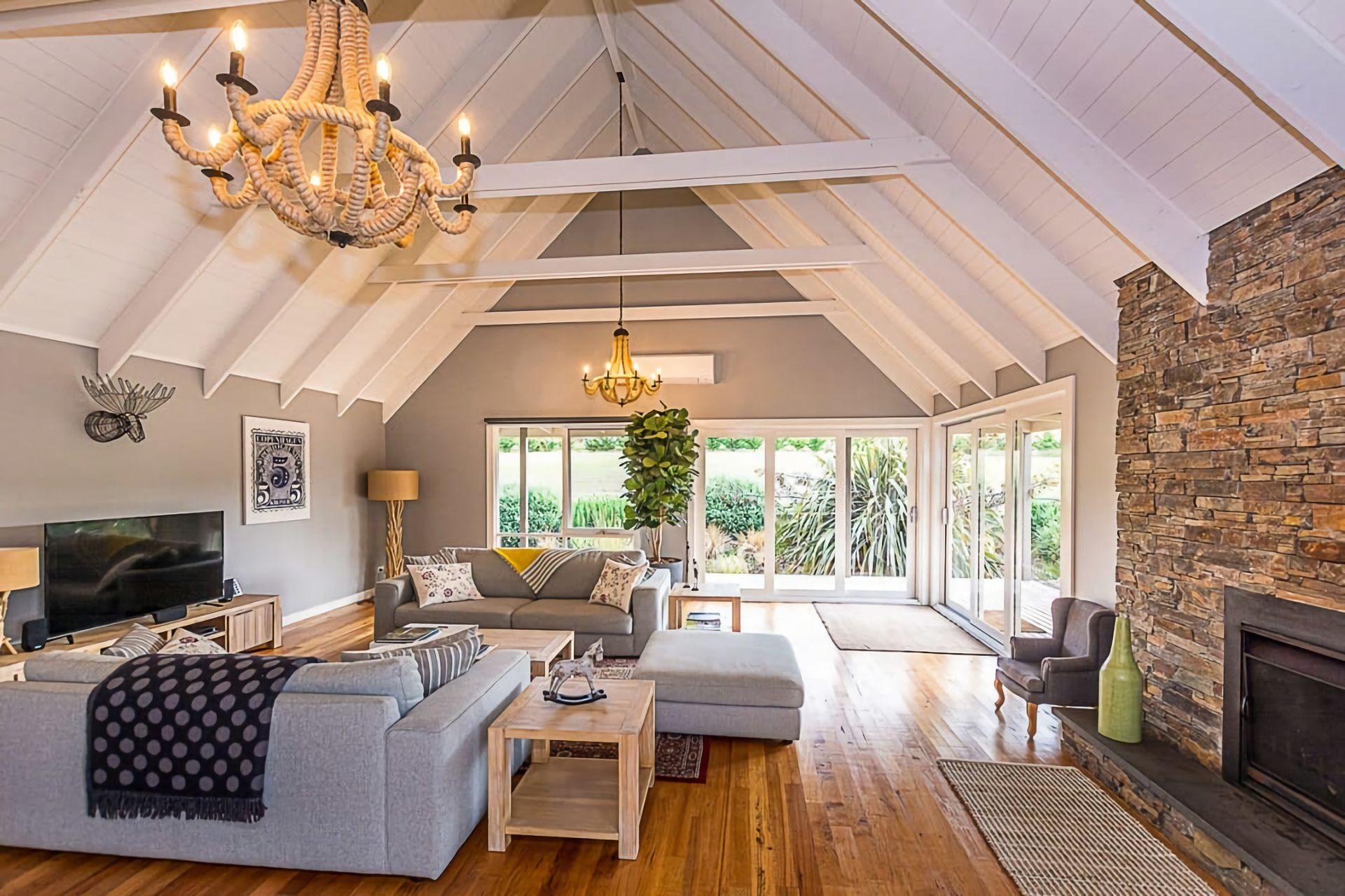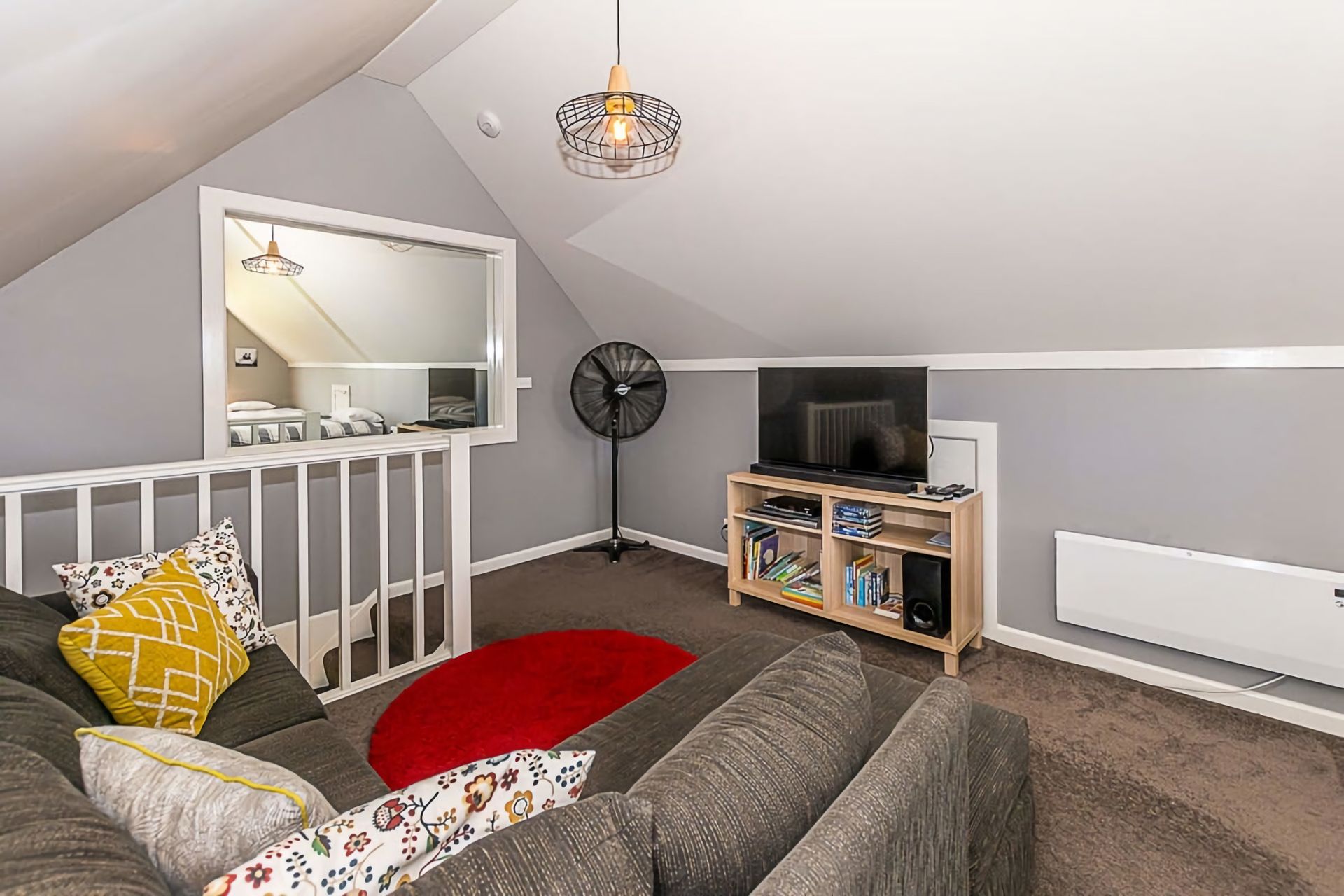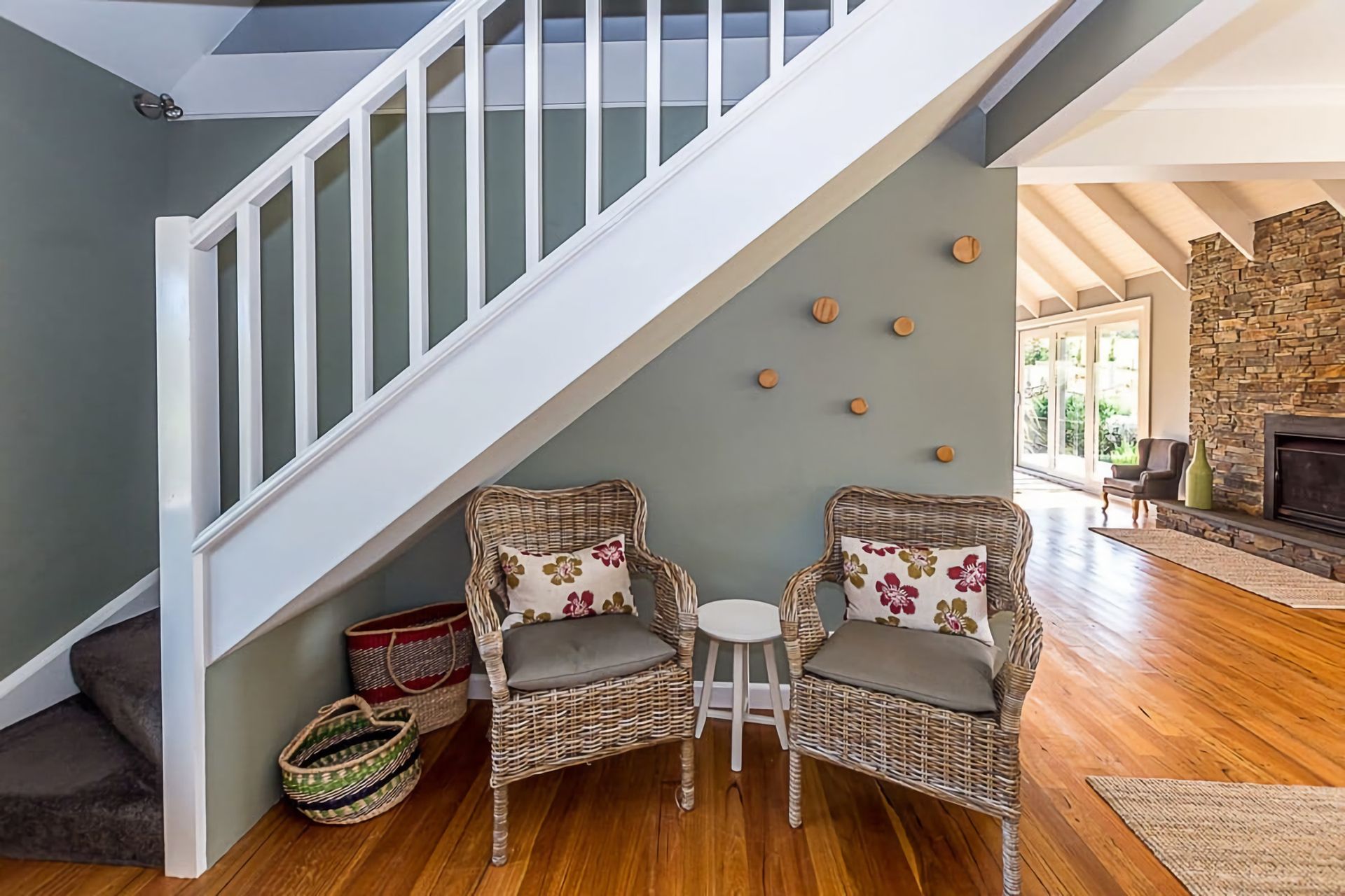 Master bedroom with ensuite and walk in robe has a queen bed. The second bedroom downstairs has 1 queen bed. The stairs lead up to the 3rd bedroom/loft which offers 3 single beds and a trundle bed incorporating a 2nd living area/kids zone. All bedrooms have ceiling fans. There is a high chair, children's dinnerware, and a selection of toys for the kids. We also have a fireplace guard.