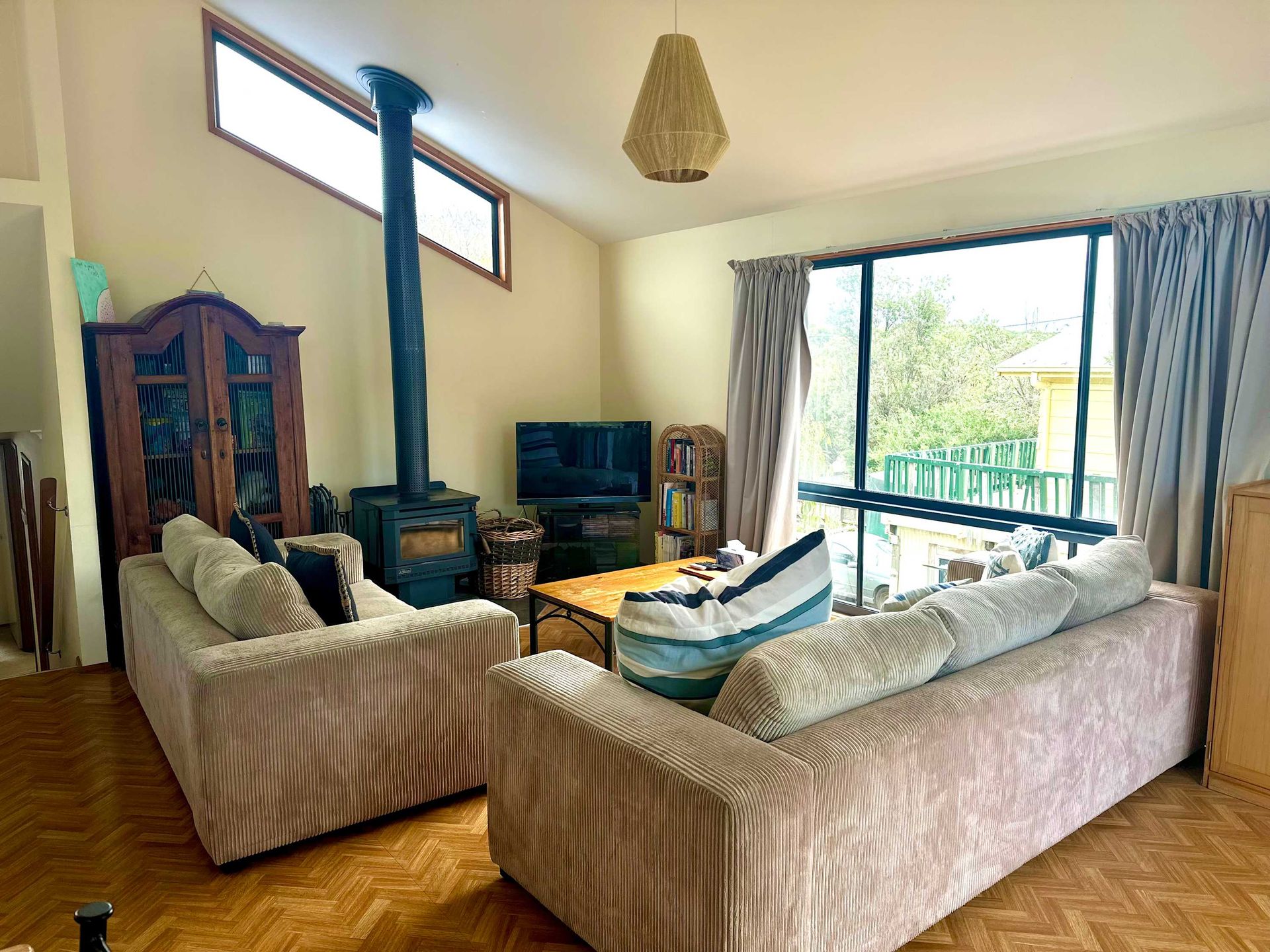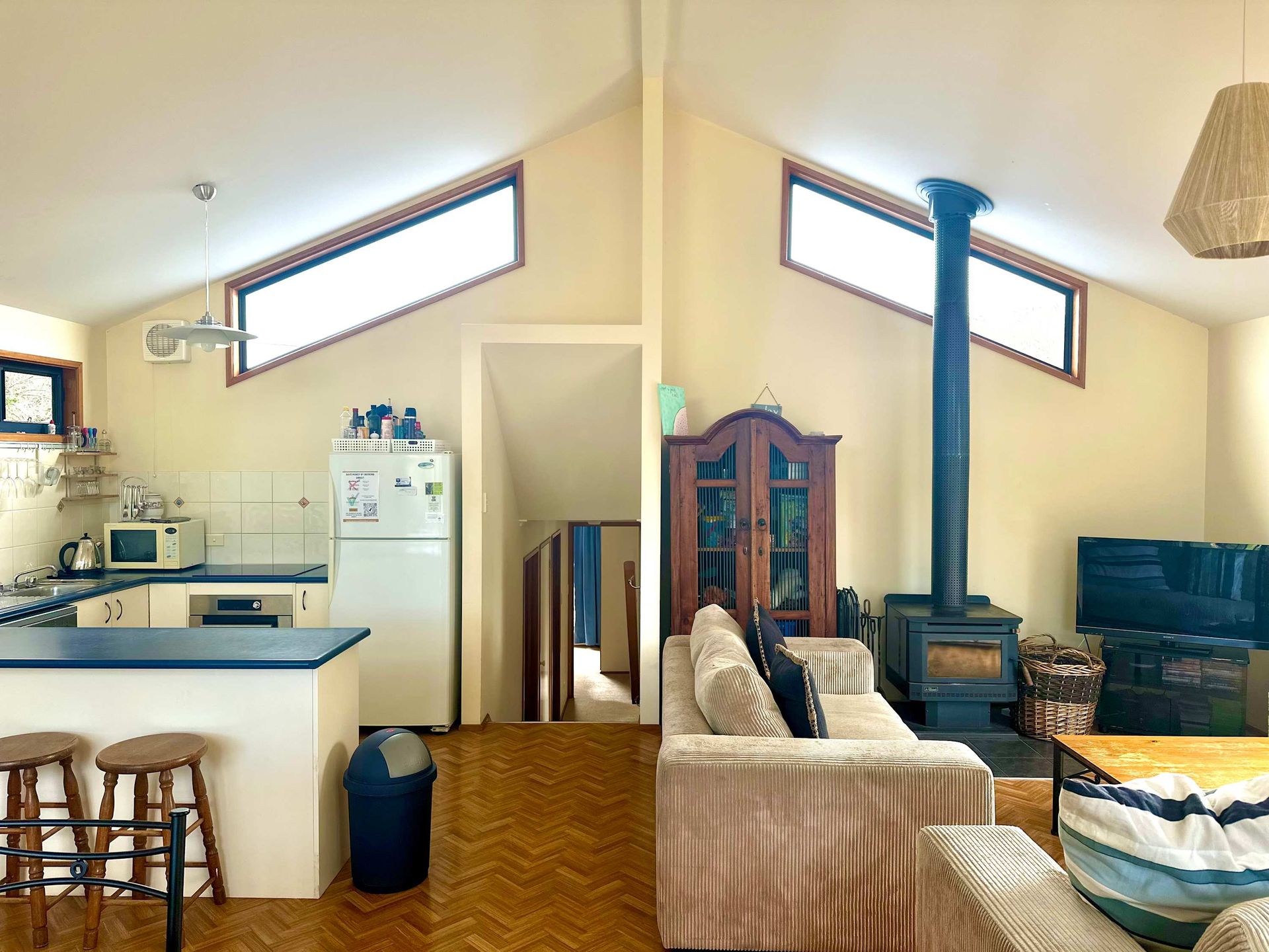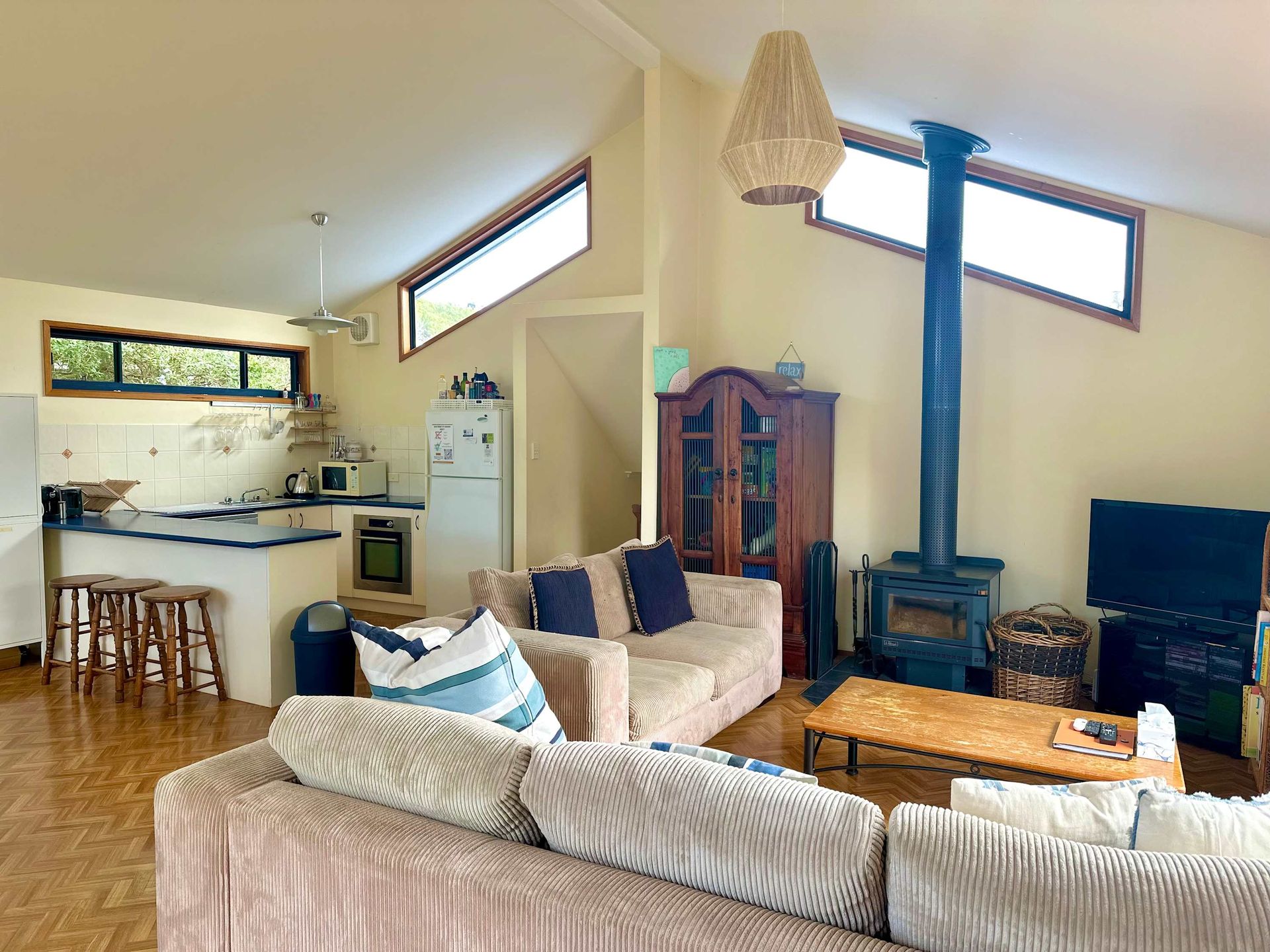 There is a good size kitchen with electric cooking, microwave and a big 2-door fridge. The lounge dining kitchen areas are combined and all very well appointed. A wood or electric heater heats the area, should the weather turn cool.