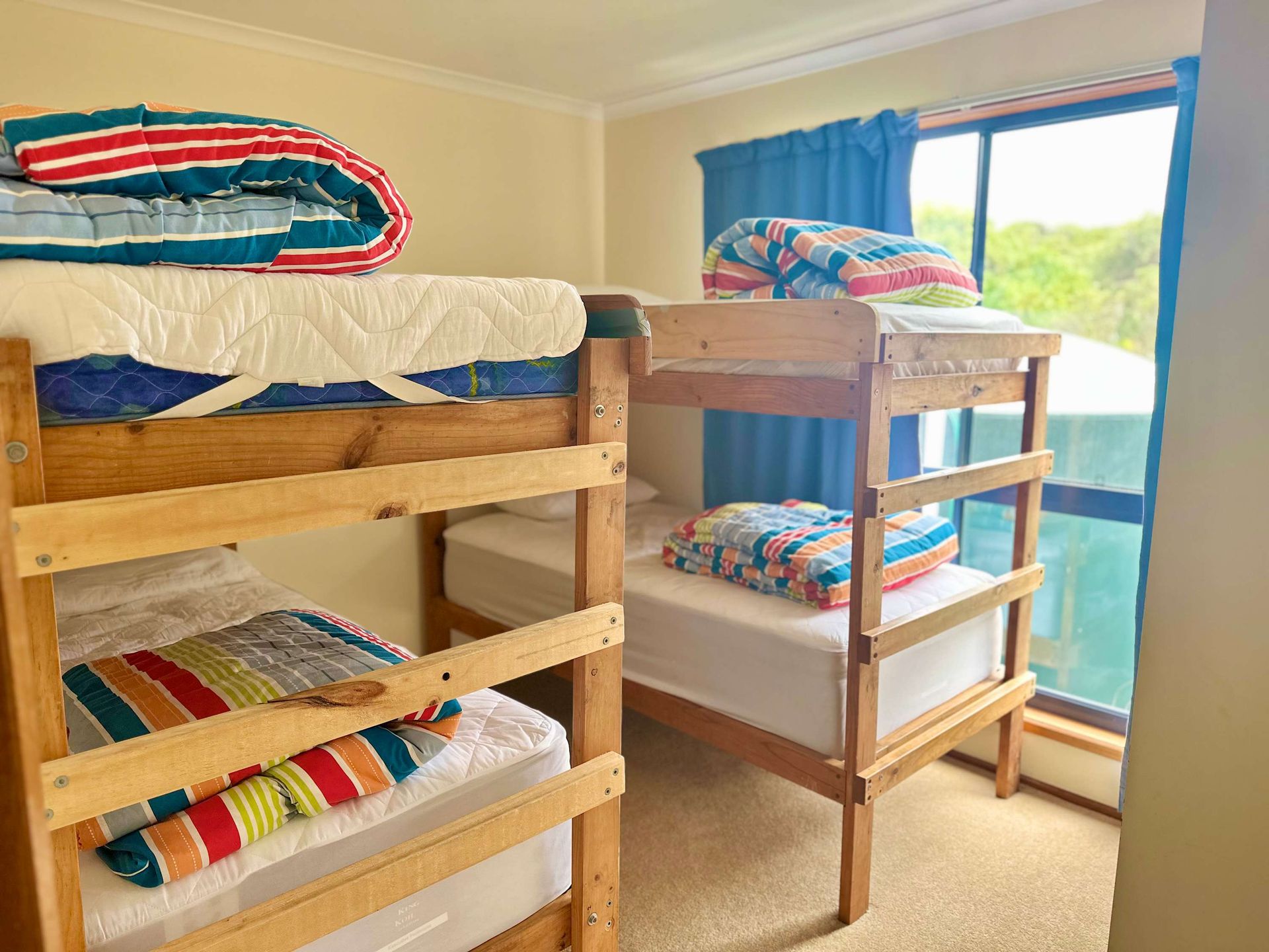 There are 3-bedrooms, one with a queen size bed (with pillow top mattress), one with a queen bed (pillow top) and a single, and the other room with two sets of bunks sleeping 9 overall.