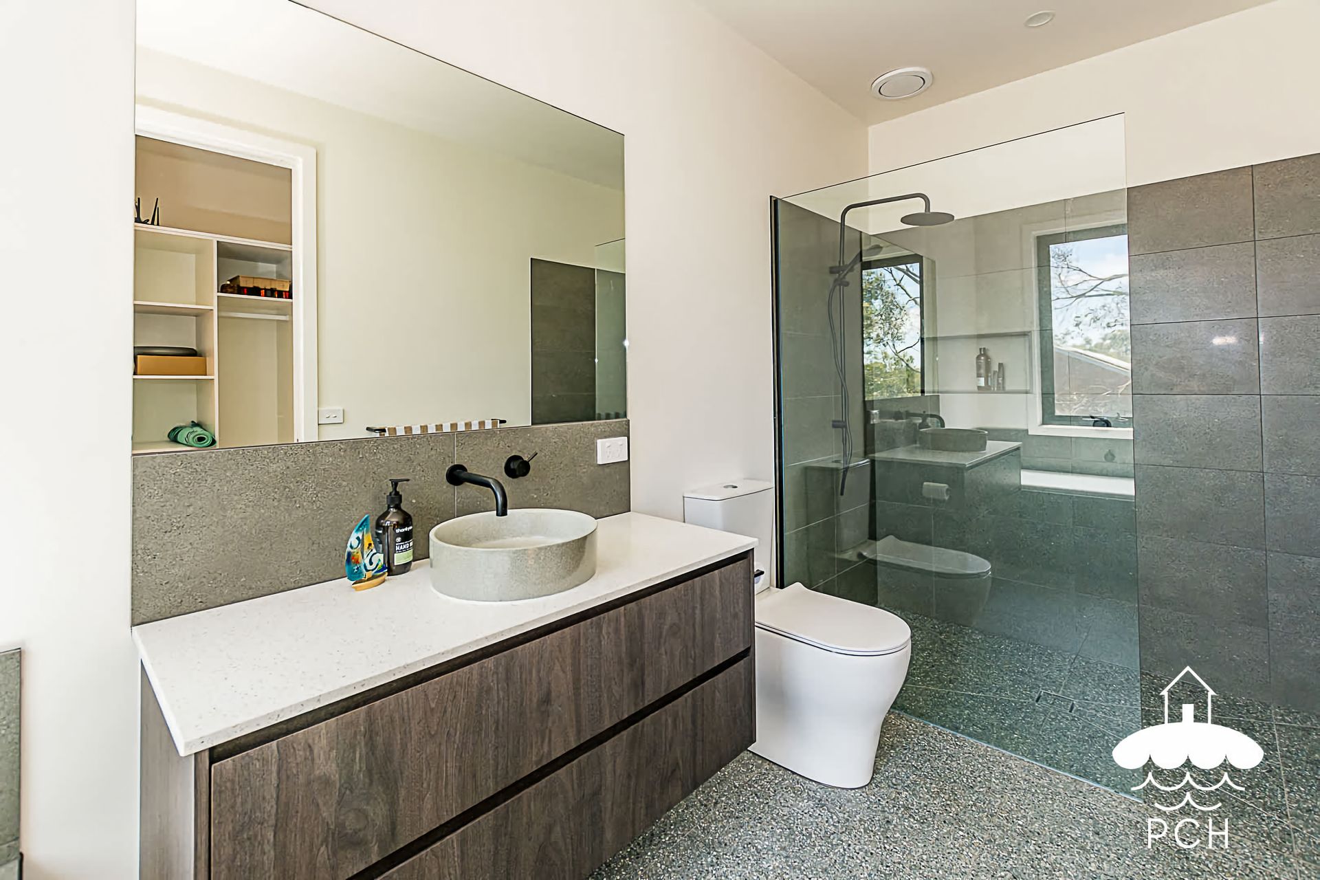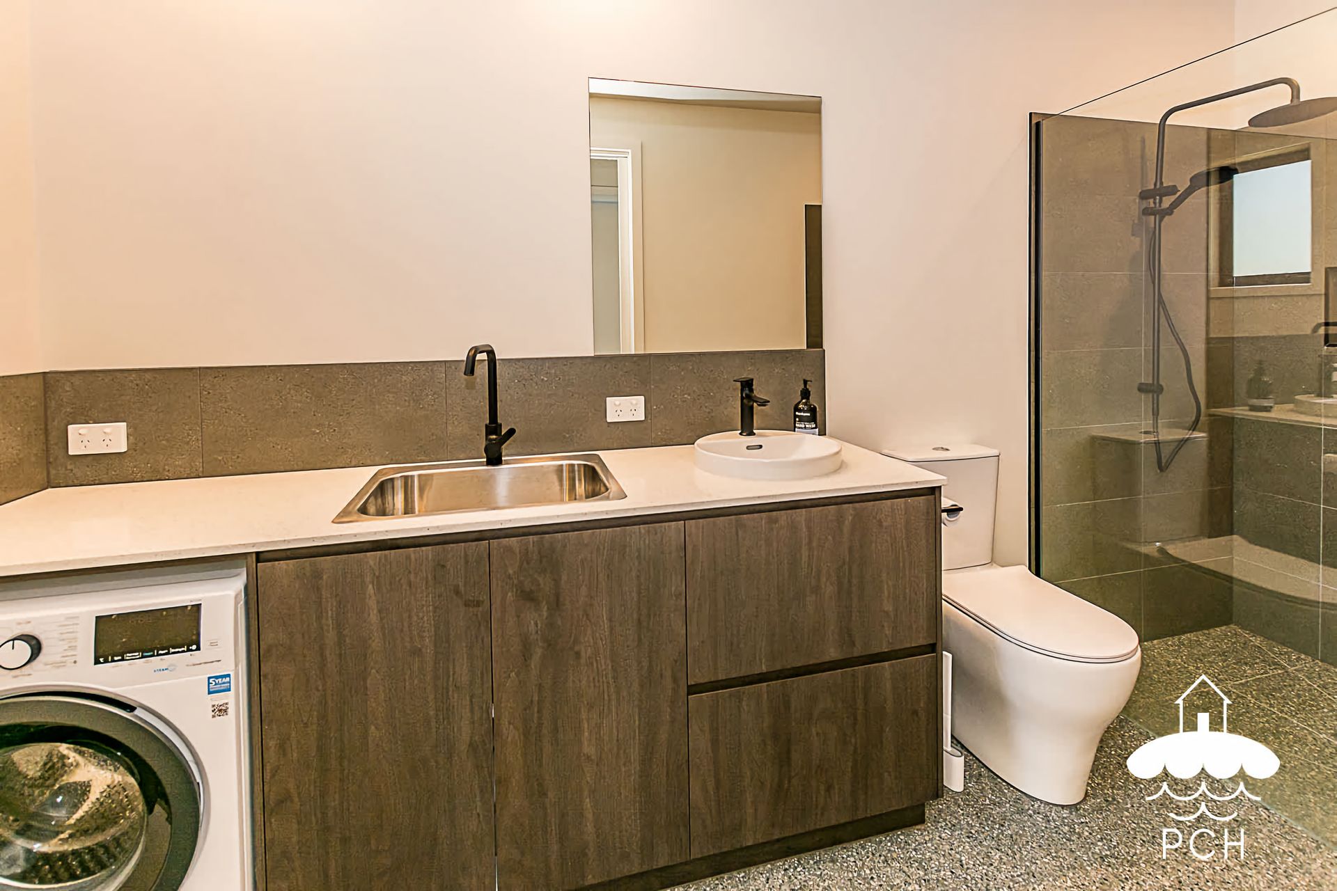 The second bathroom doubles as the laundry, with a toilet, shower, basin and washing machine.