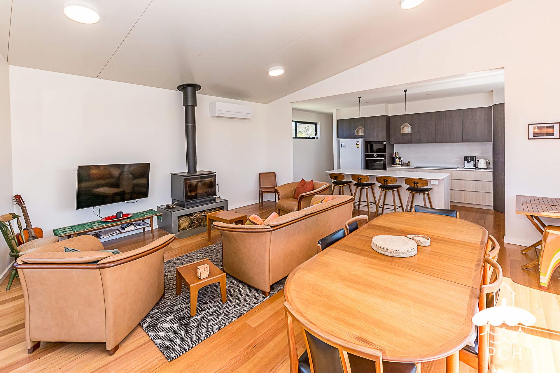 The lounge space is large and open plan with the kitchen and dining, with a Coonara combustion fireplace which radiates the space in winter. There is a split system fitted in this shared space for the summer months.