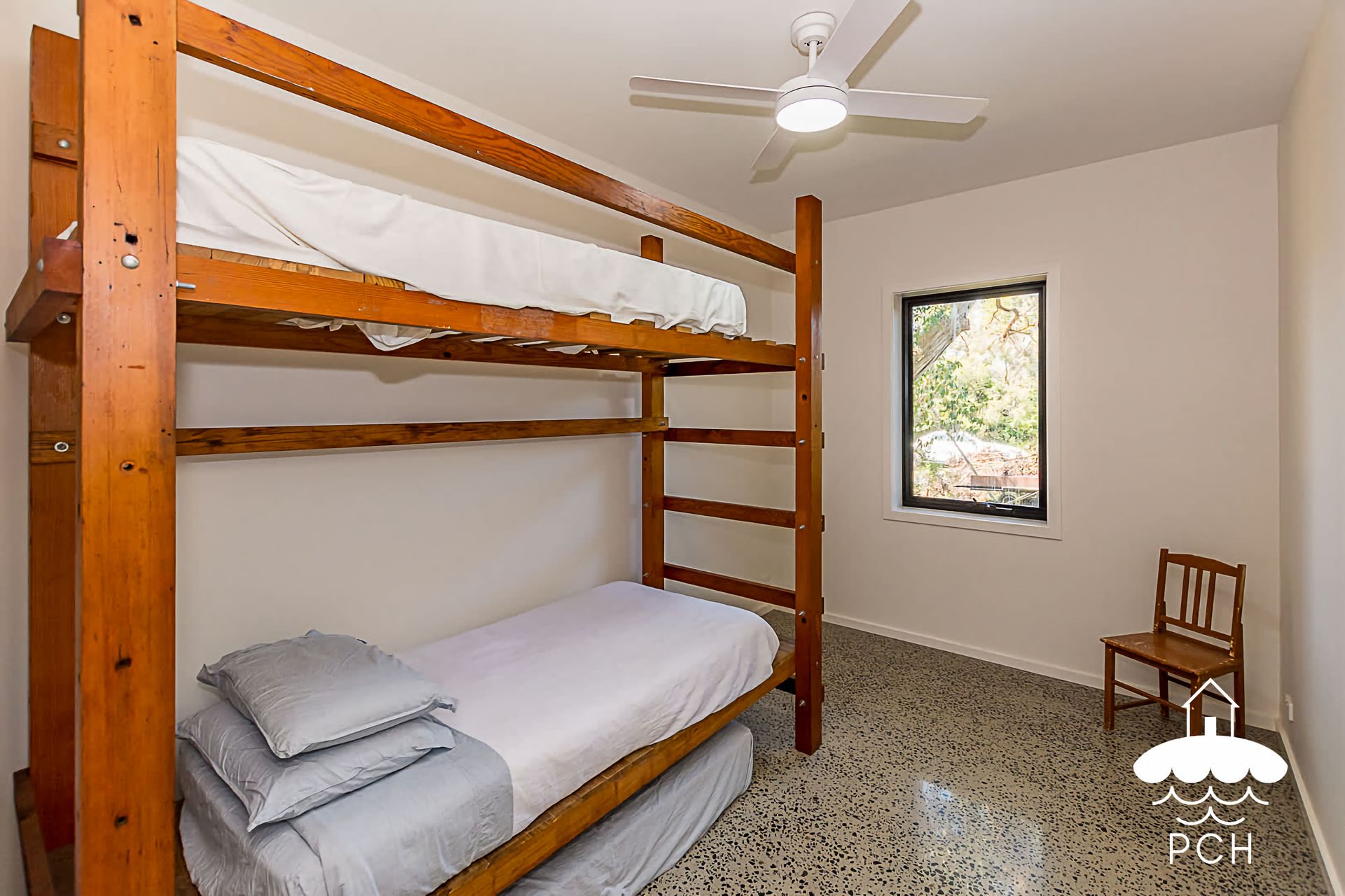 The downstairs level of the home contains the two remaining bedrooms - one containing a Queen Bed, the other a single set of bunks. There is an additional single floor mattress in this space.