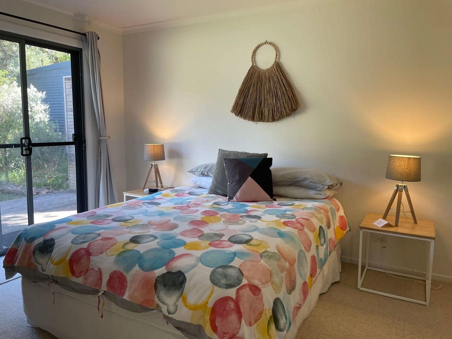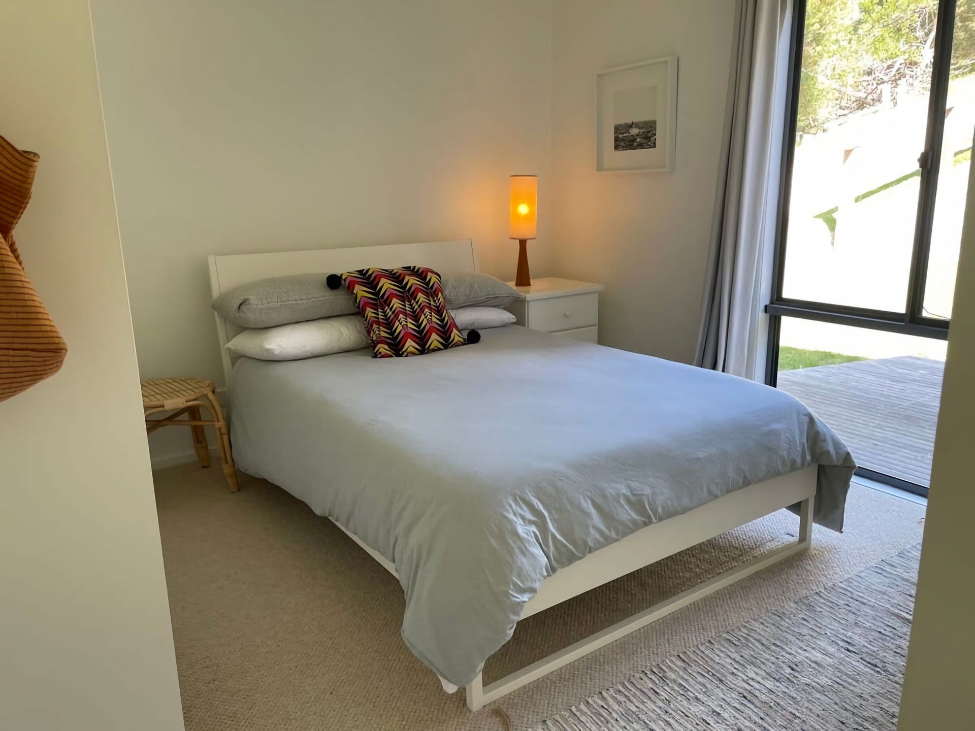There are three bedrooms, sleeping 7overall. The master bedroom has a queen bed, a walk in wardrobe and a fully equipped ensuite bathroom including a huge bath. There is a sliding door which leads onto a deck which also has an outdoor shower. Bedroom two has a double bed and bedroom three a single bed over double bed.