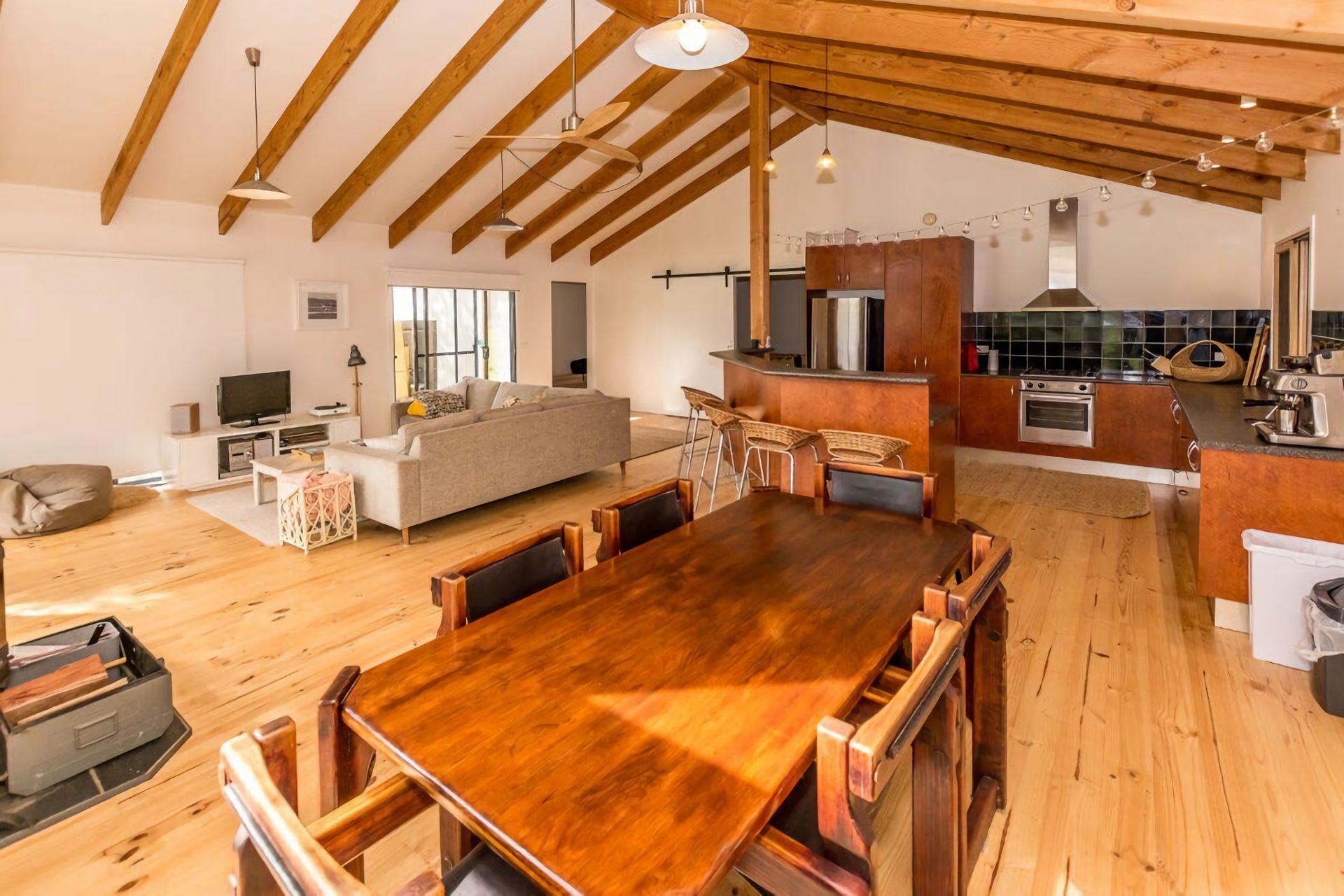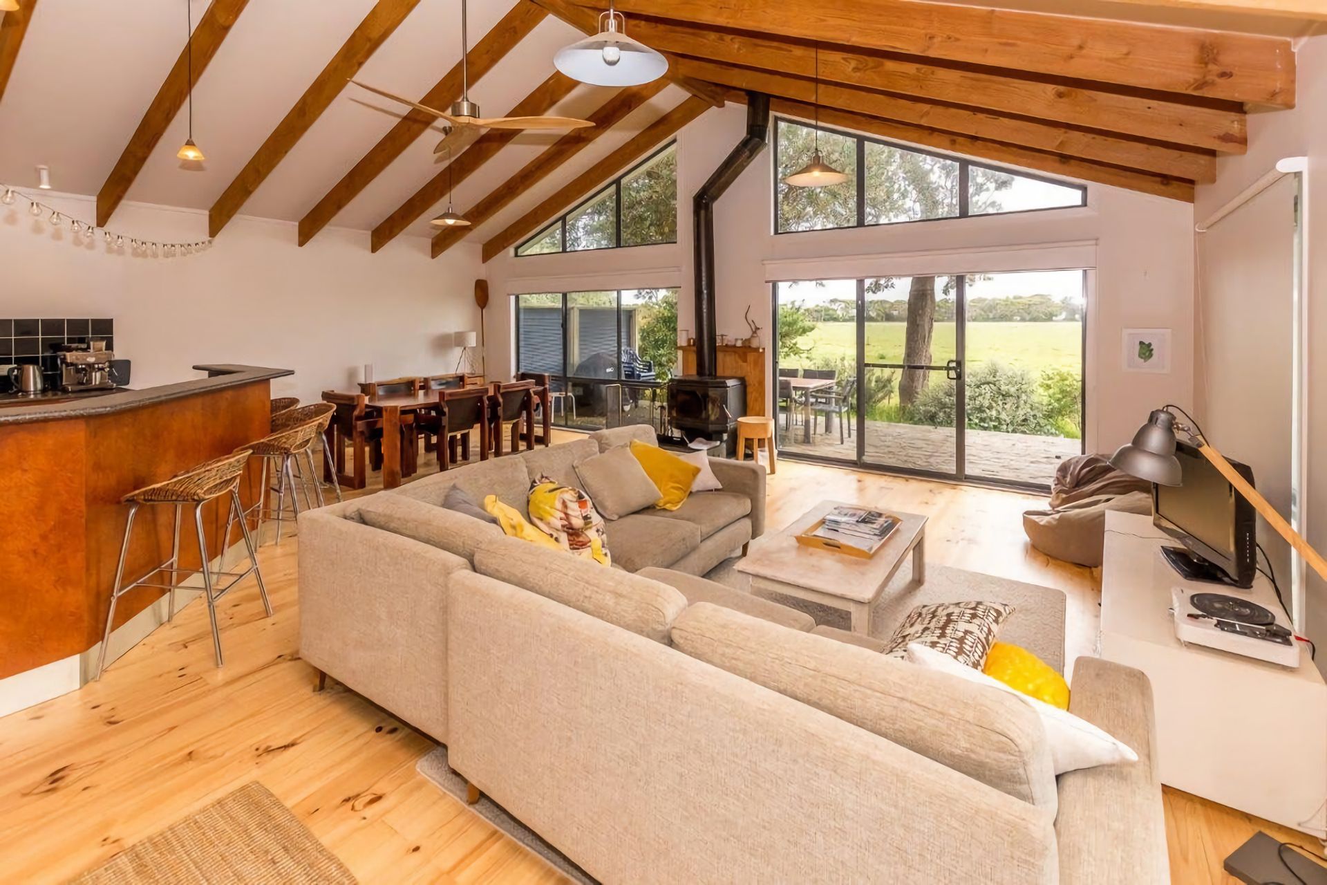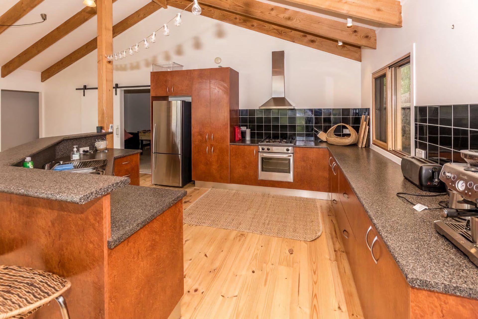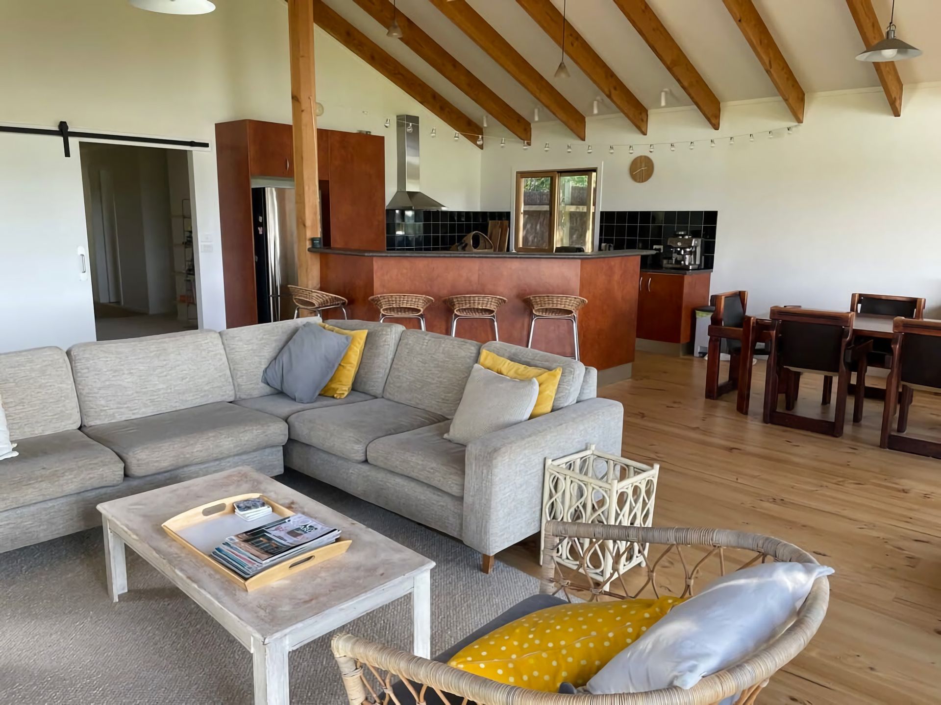 The kitchen is very well equipped with upmarket appliances, including a dishwasher, and Breville Espresso coffee machine (just bring Beans). There is a large island bench overlooking the living area.