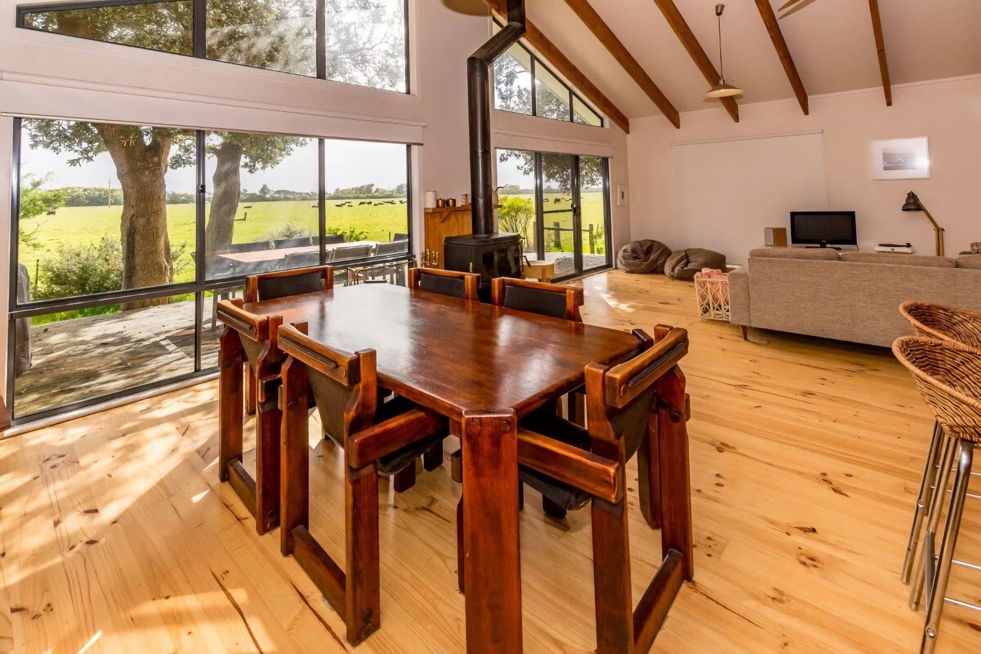 The living and dining area are very comfortably furnished and feature a wood heater for winter warmth. There is a TV, DVD player and a sound system. There is an additional lounge area adjoining the dining area.