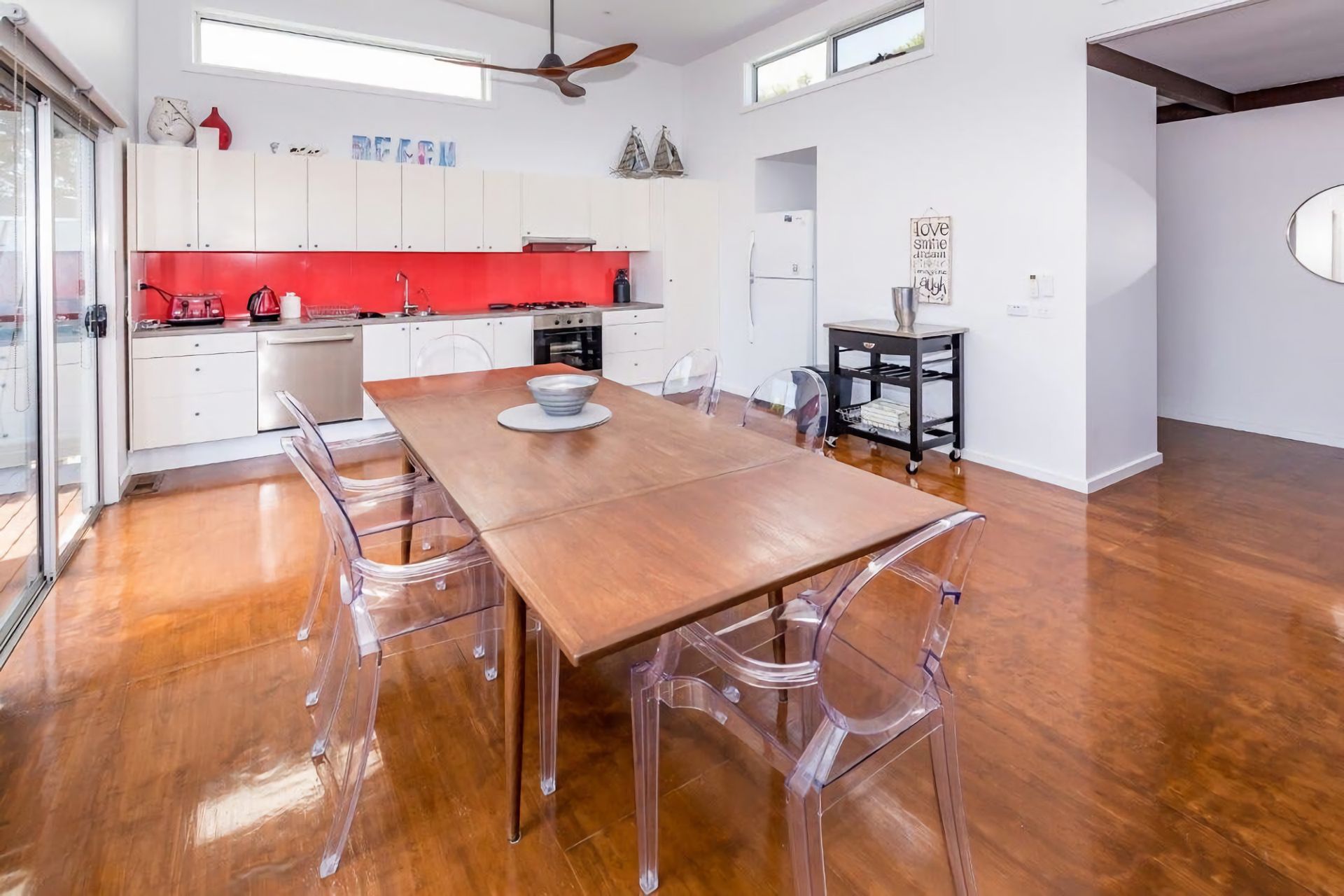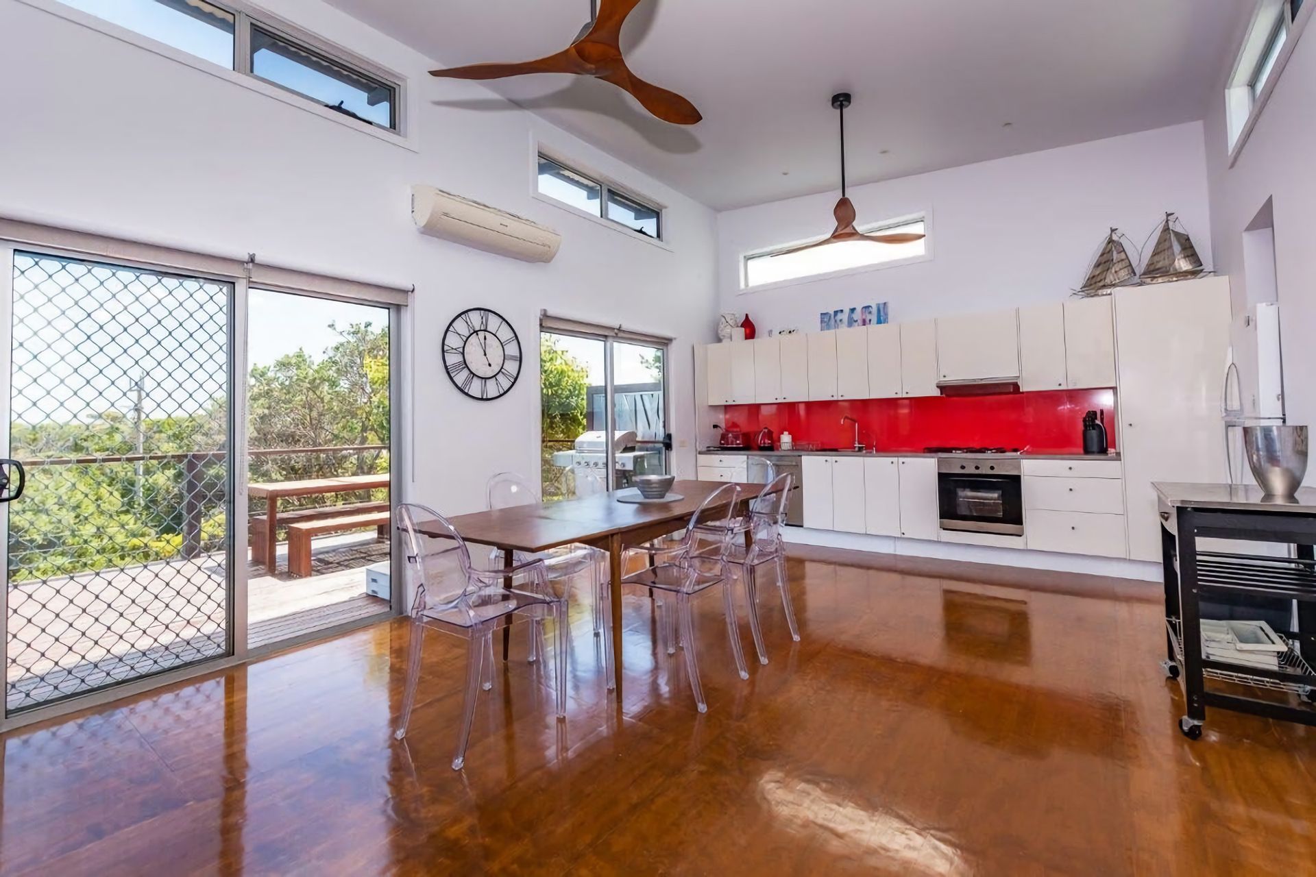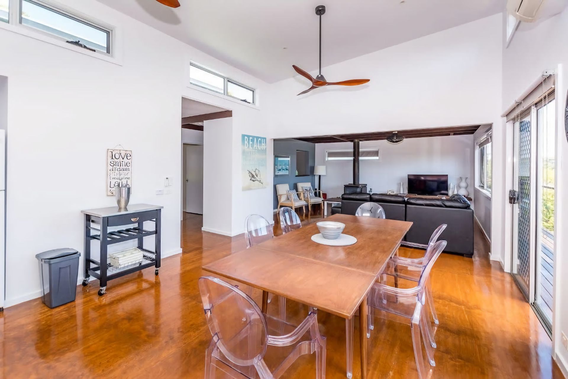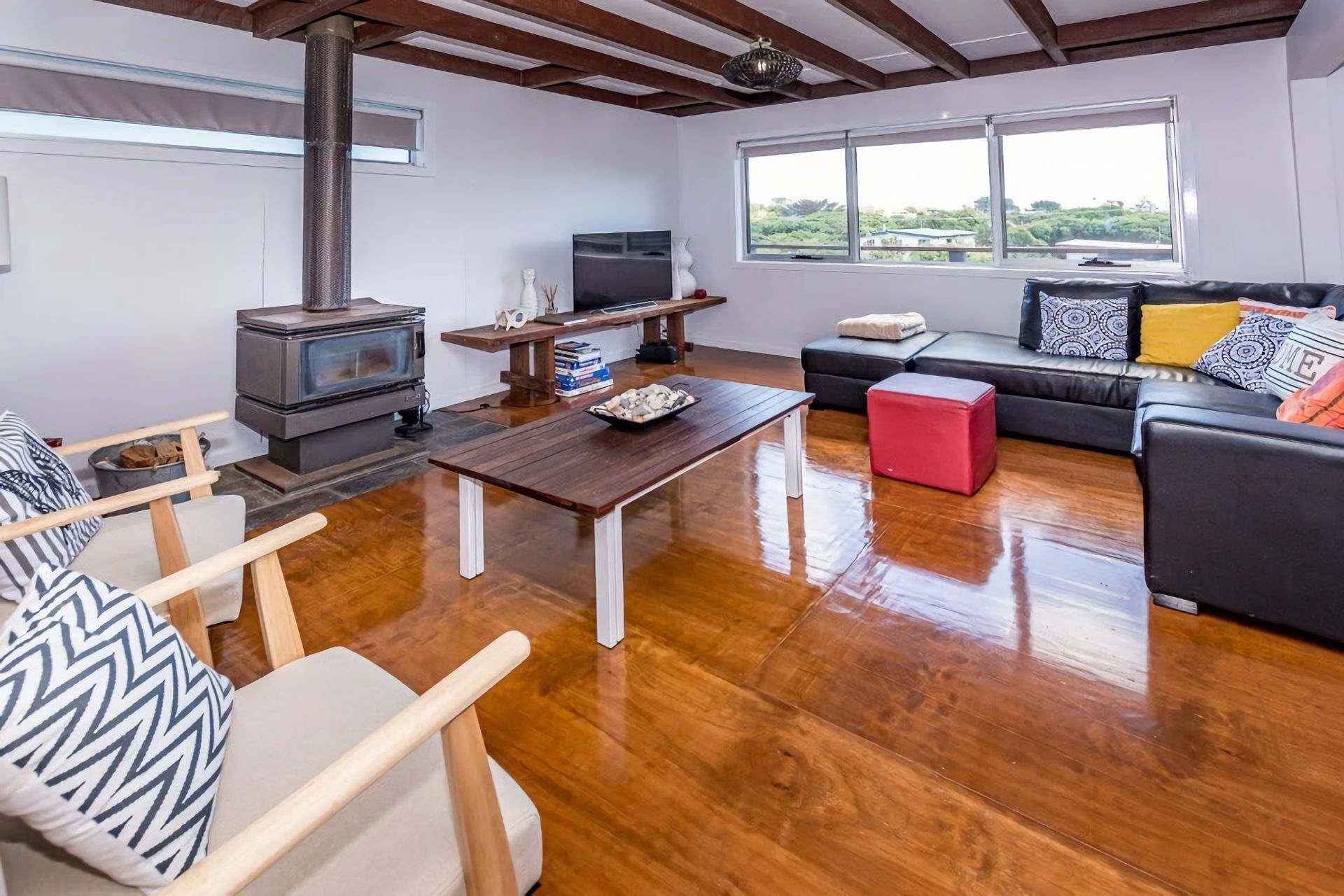 Well appointed modern home with open plan design, polished timber floors, RC/AC, solid fuel heater, large deck/alfresco area. The master bedroom has a Queen bed, the second has a Double with a Single bunk above. Laundry facilities are also available for use in this home.
