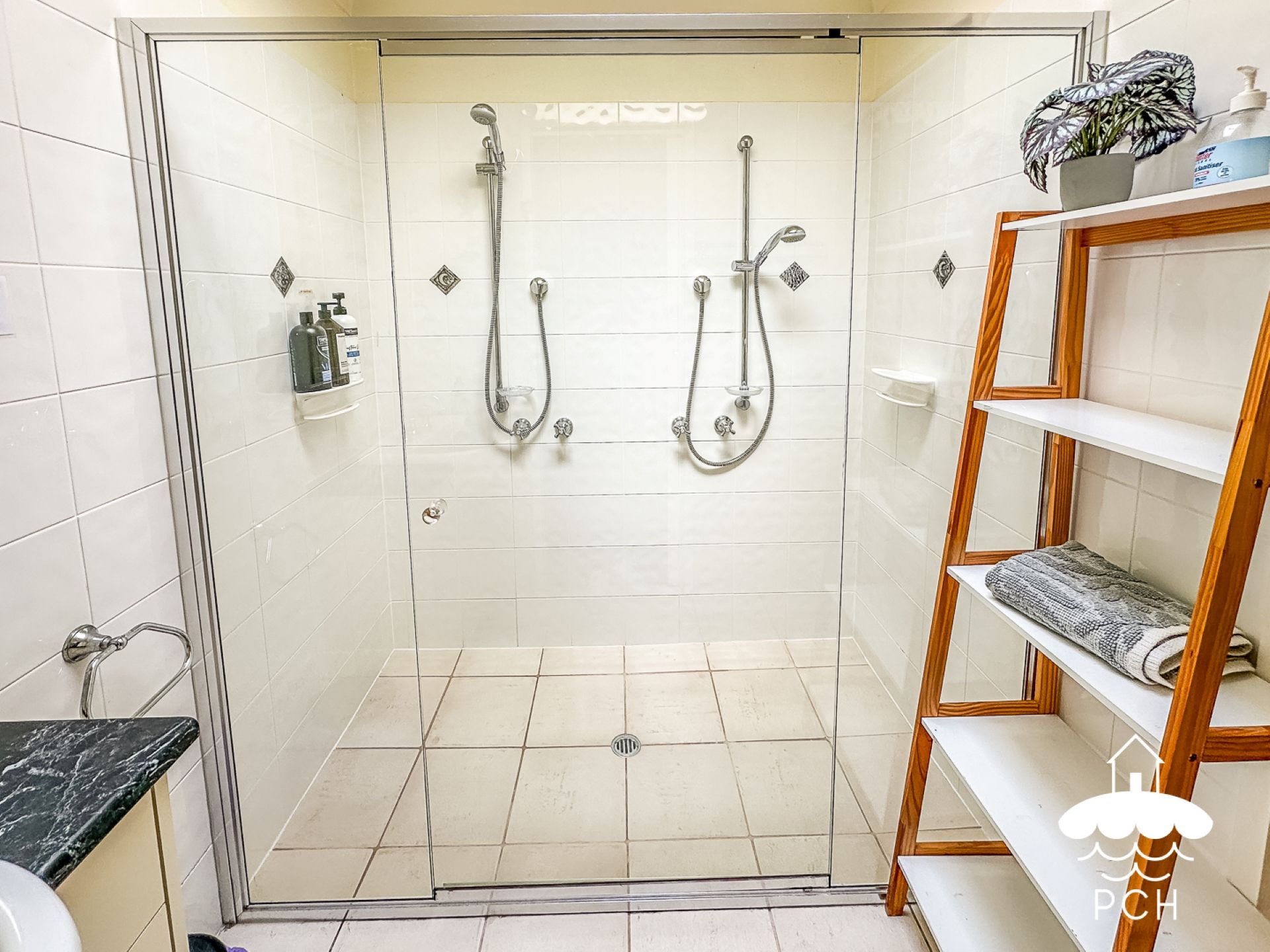 The bathroom includes a large double shower with a separate toilet, and the laundry is equipped with a washing machine and dryer.
