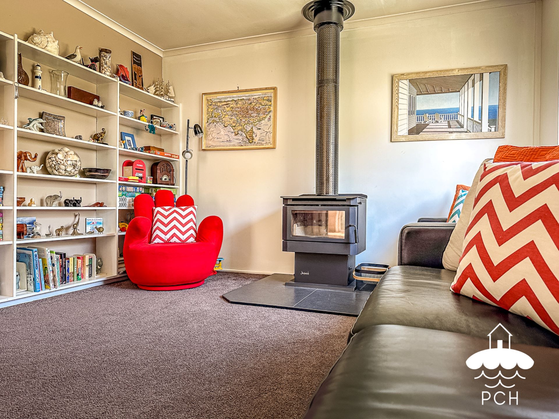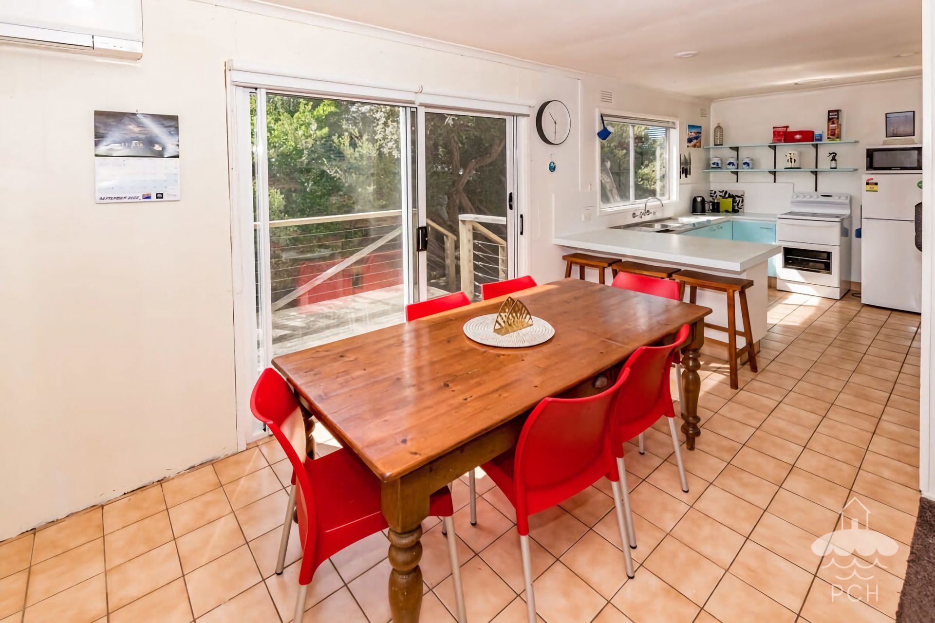 Upstairs, the retro-style kitchen opens into a light-filled dining and lounge area, featuring a new wood heater and split-system heating and cooling for year-round comfort. Large windows frame leafy treetop and township views, while both front and rear decks invite you to sit back, relax, and soak up the coastal atmosphere. A BBQ is provided for easy outdoor entertaining.