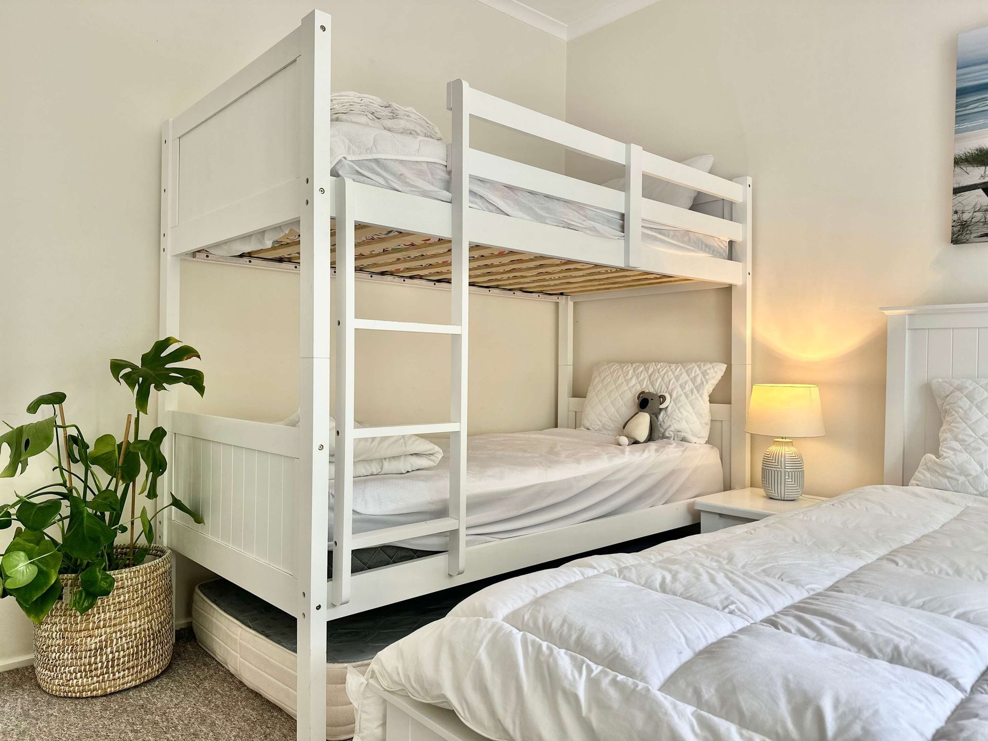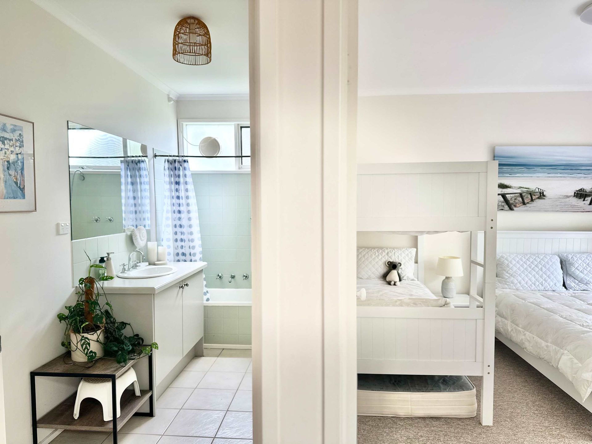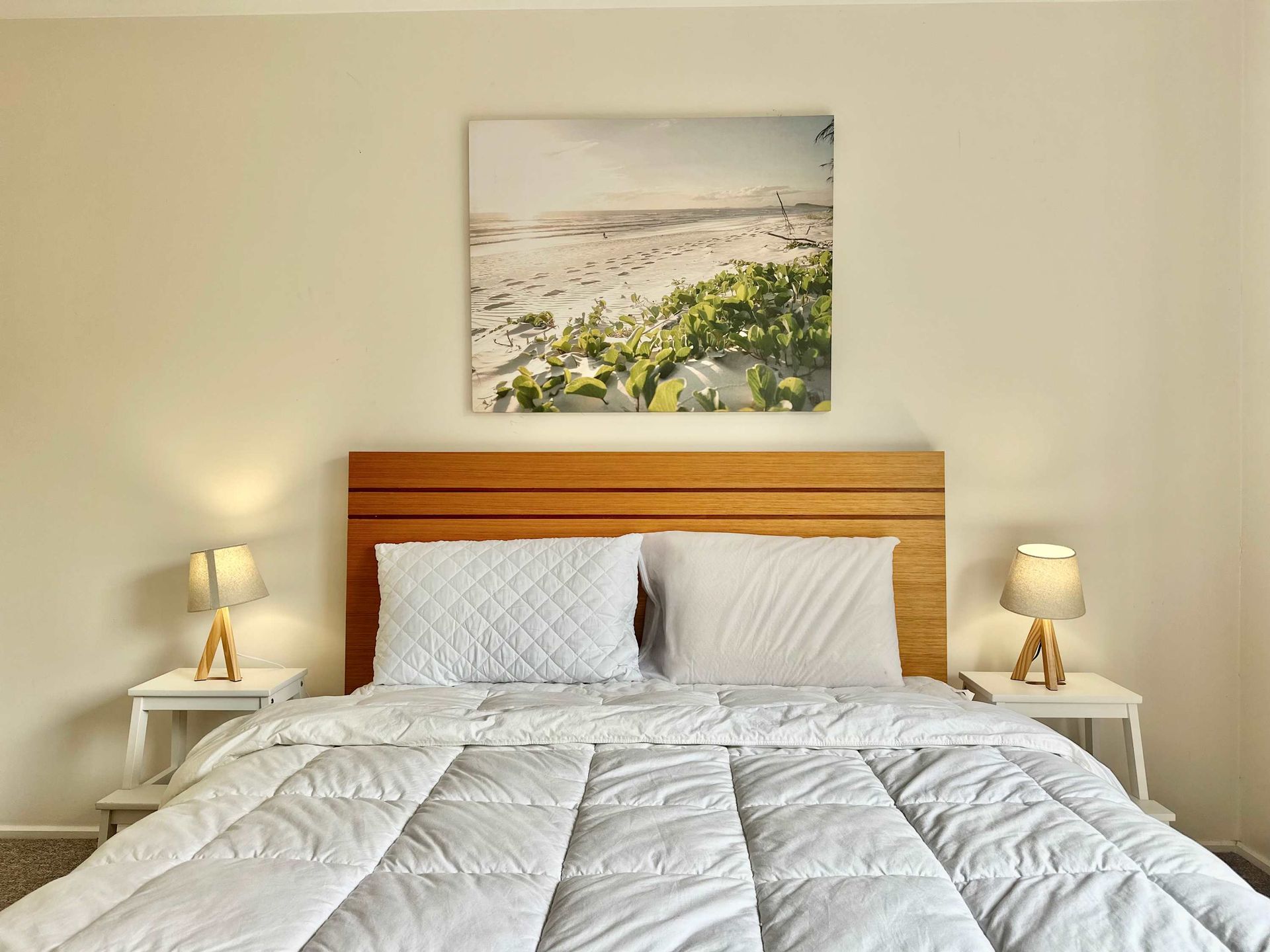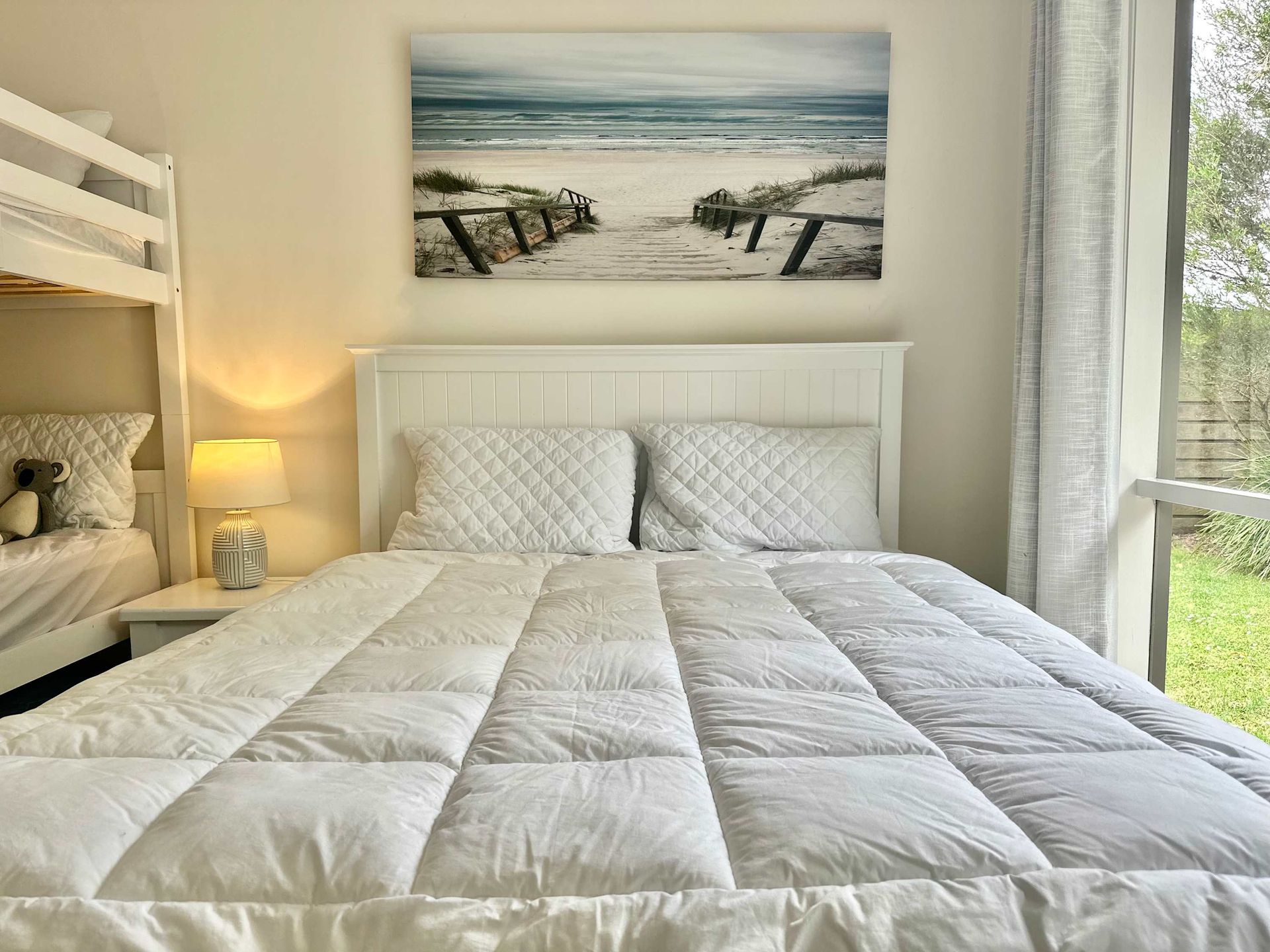 The master bedroom has a Queen bed and its own private balcony and TV. The second bedroom upstairs has a Queen bed and a single bed. The third bedroom with a queen and 2 single beds (bunks), located downstairs, also has built in wardrobes and ceiling fan. Bedding (ie doonas, pillows and blankets) is provided but guests must bring their own linen (doona covers, sheets and pillow cases) and towels (beach, bath and hand).