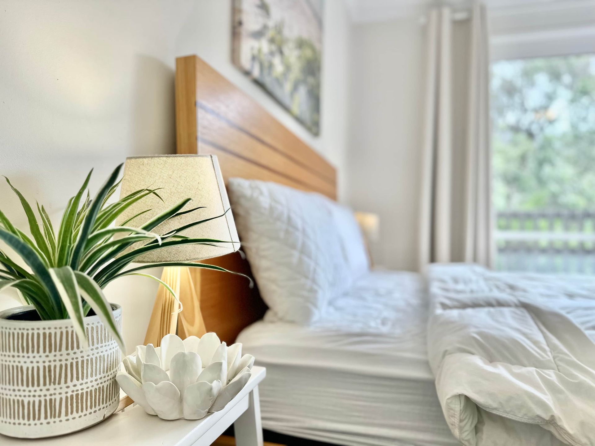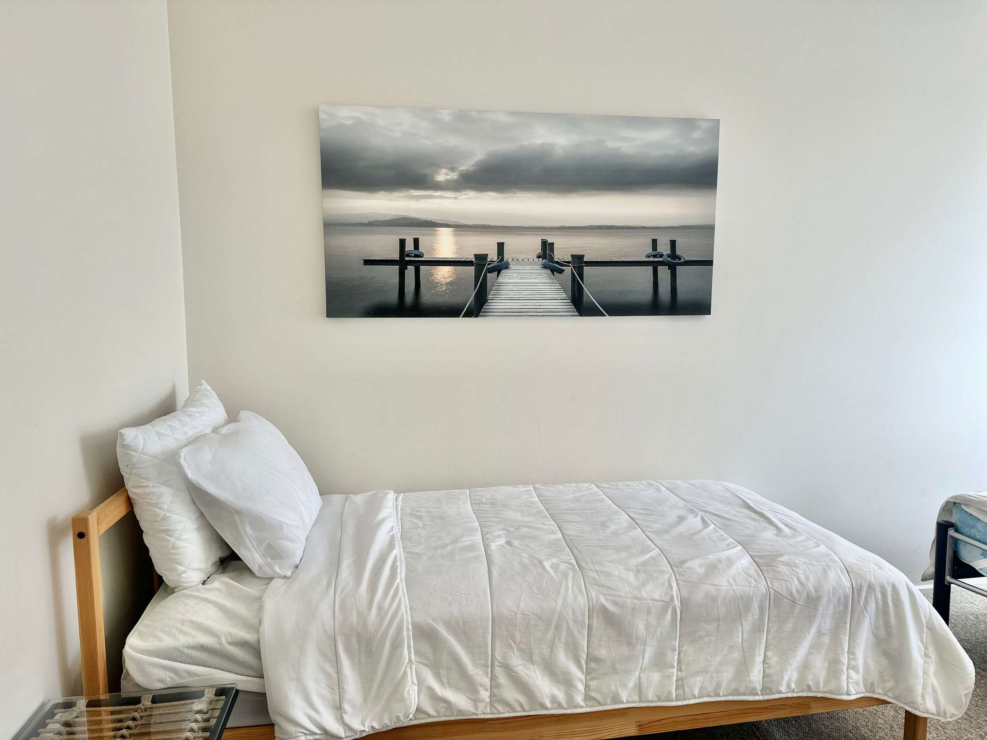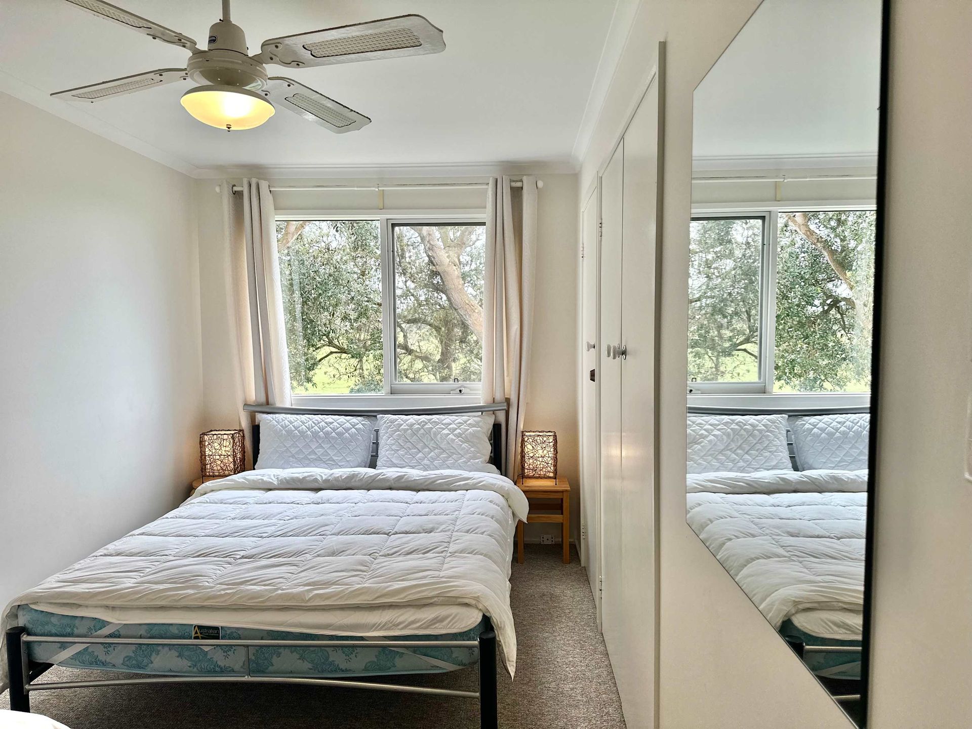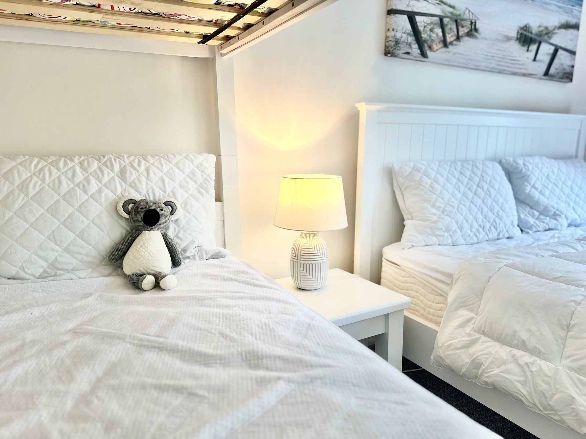 The master bedroom has a Queen bed and its own private balcony and TV. The second bedroom upstairs has a Queen bed and a single bed. The third bedroom with a queen and 2 single beds (bunks), located downstairs, also has built in wardrobes and ceiling fan. Bedding (ie doonas, pillows and blankets) is provided but guests must bring their own linen (doona covers, sheets and pillow cases) and towels (beach, bath and hand).